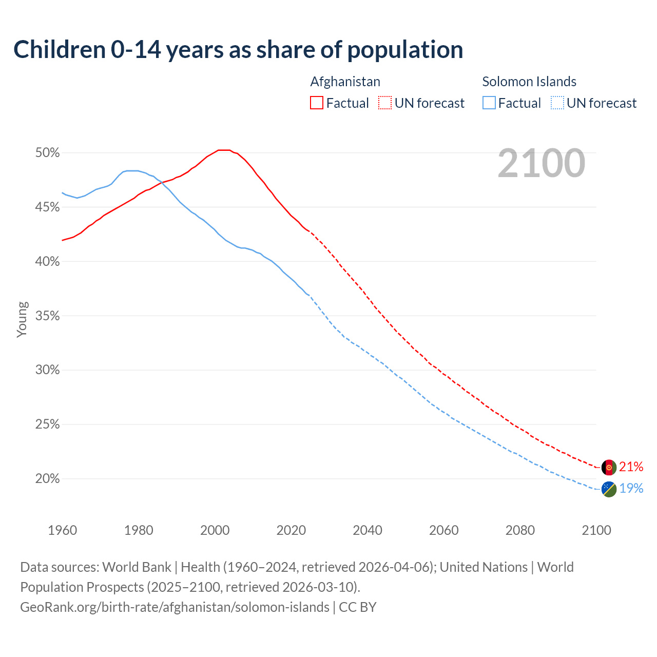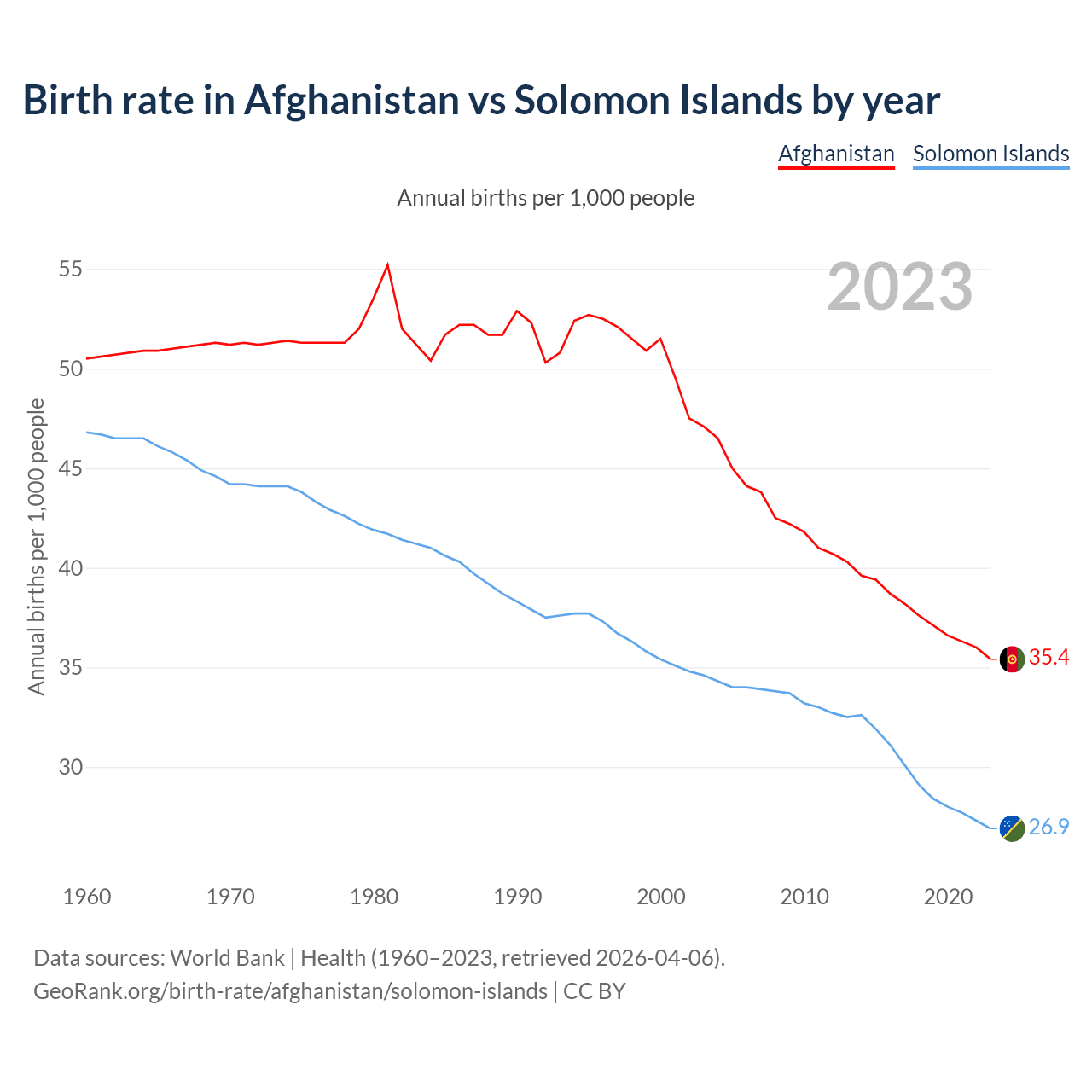 Afghanistan has an annual birth rate of 35.4 births per 1,000 people, compared to 26.9 for the Solomon Islands. The average number of children a woman is expected to have during her lifetime — the fertility rate, is 4.84 in Afghanistan and 3.56 in the Solomon Islands — 26.5% difference.