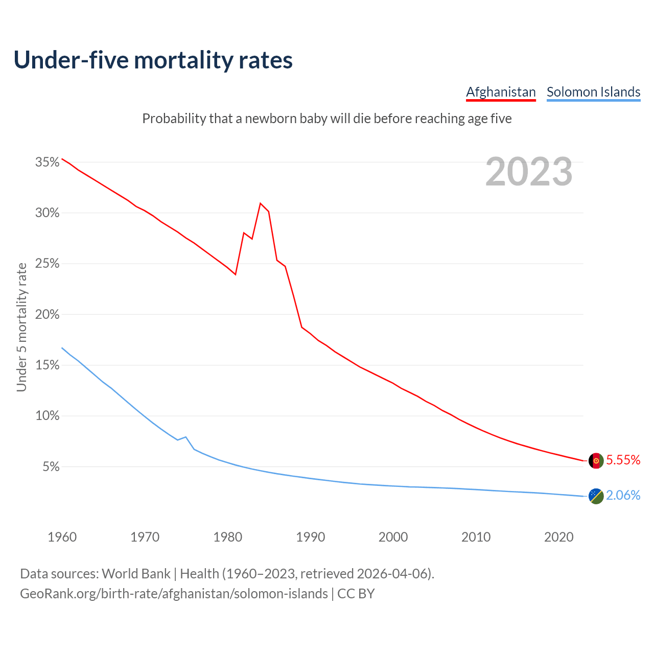 The chance that a newborn baby will die before reaching age five is 5.55% in Afghanistan and 2.06% in the Solomon Islands. Above is a chart with historical data on under-five mortality rates.