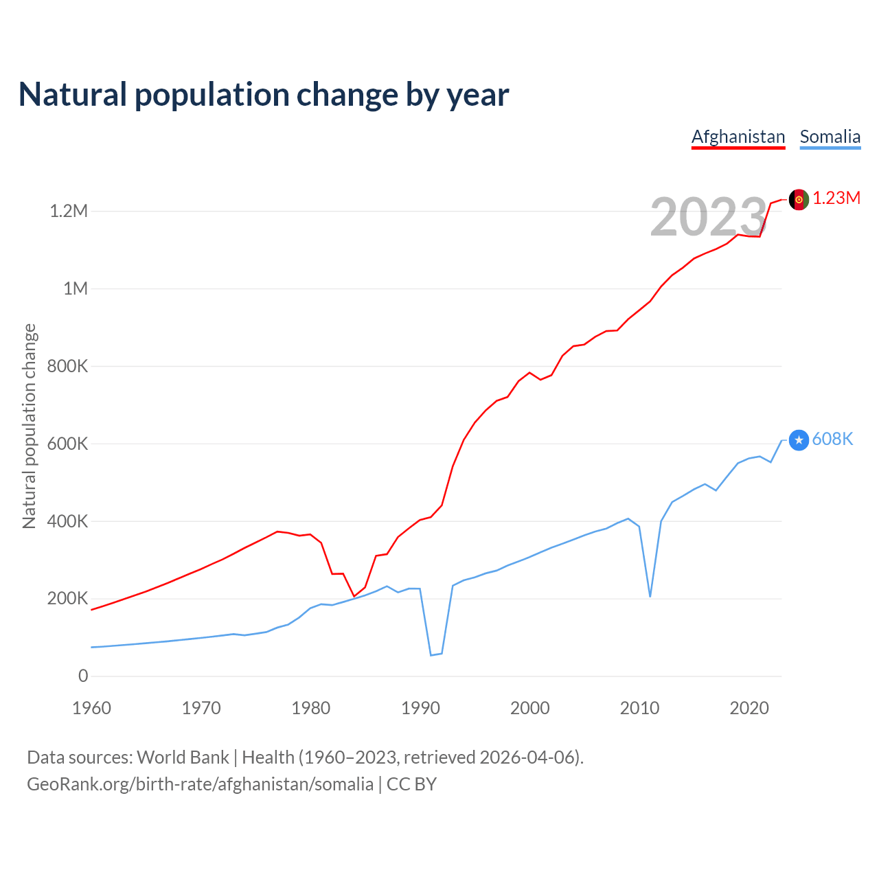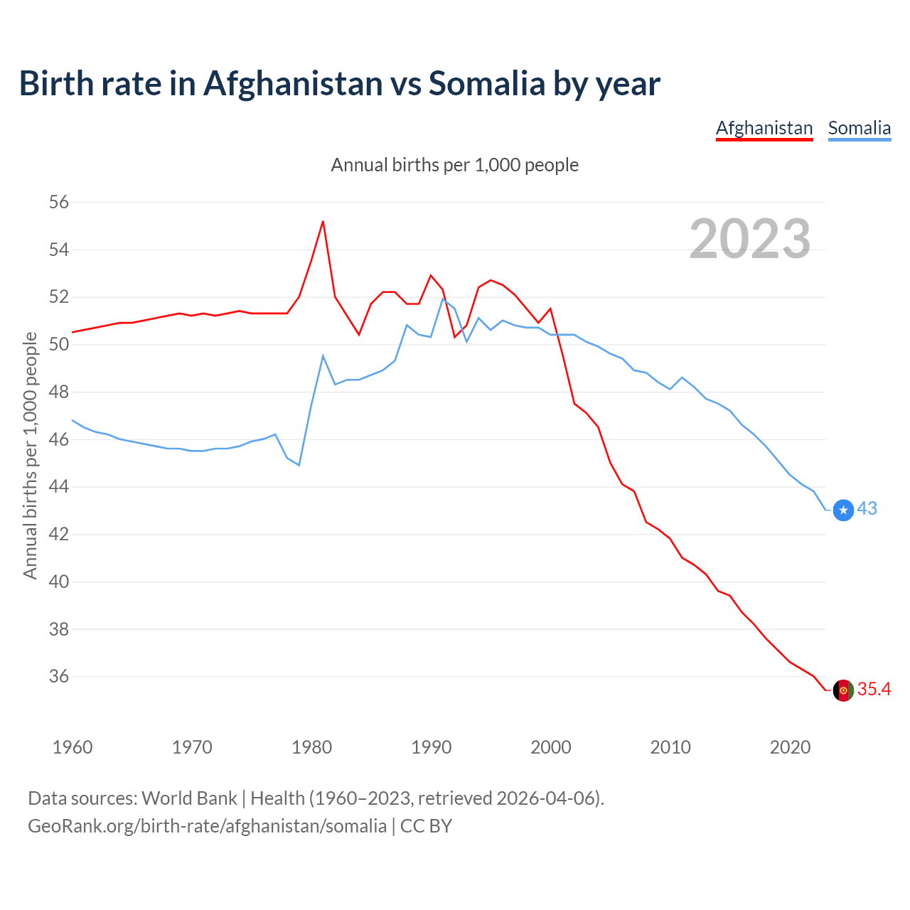 Afghanistan has an annual birth rate of 35.4 births per 1,000 people, compared to 43 for Somalia. The average number of children a woman is expected to have during her lifetime — the fertility rate, is 4.84 in Afghanistan and 6.13 in Somalia — 26.7% difference.