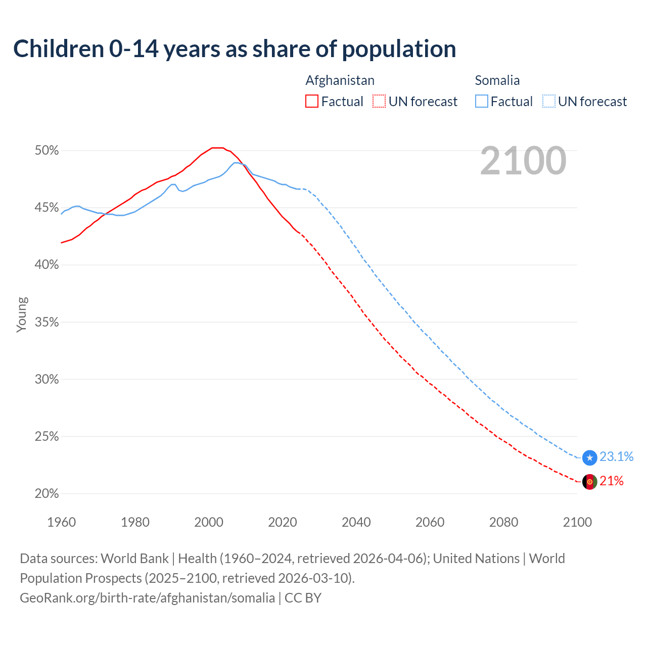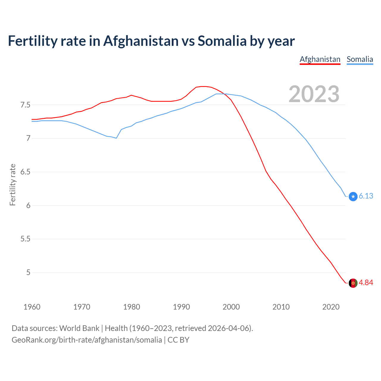 According to the latest available data on birth rates, the fertility rate in Afghanistan was 4.84 children per woman in 2023, compared to 6.13 in Somalia in 2023. The replacement level is considered to be 2.1 children per woman.