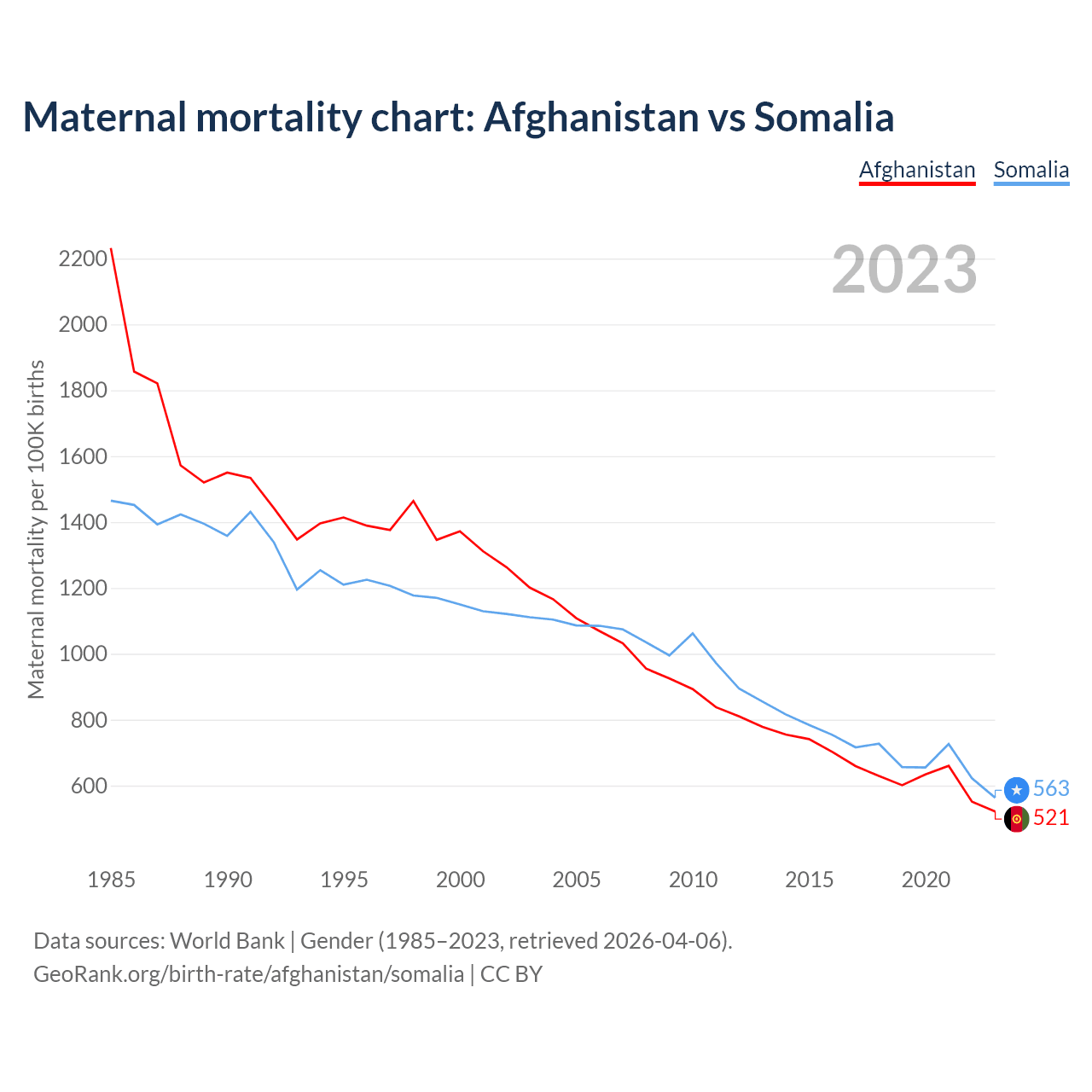 The maternal mortality rate, which is the probability of dying during childbirth or within 42 days of pregnancy termination, is 521 deaths per 100,000 live births in Afghanistan, compared to 563 deaths in Somalia.
