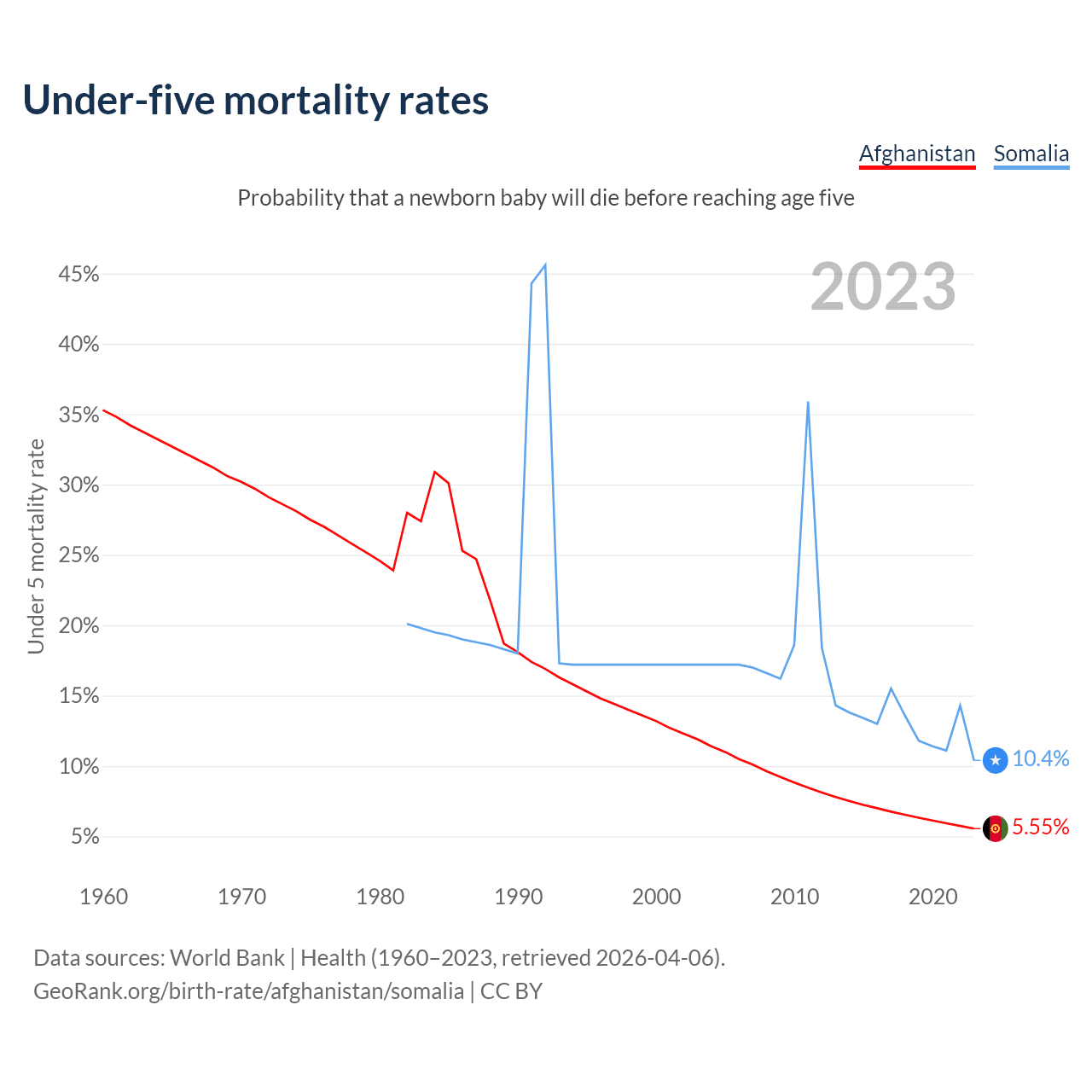 The chance that a newborn baby will die before reaching age five is 5.55% in Afghanistan and 10.4% in Somalia. Above is a chart with historical data on under-five mortality rates.
