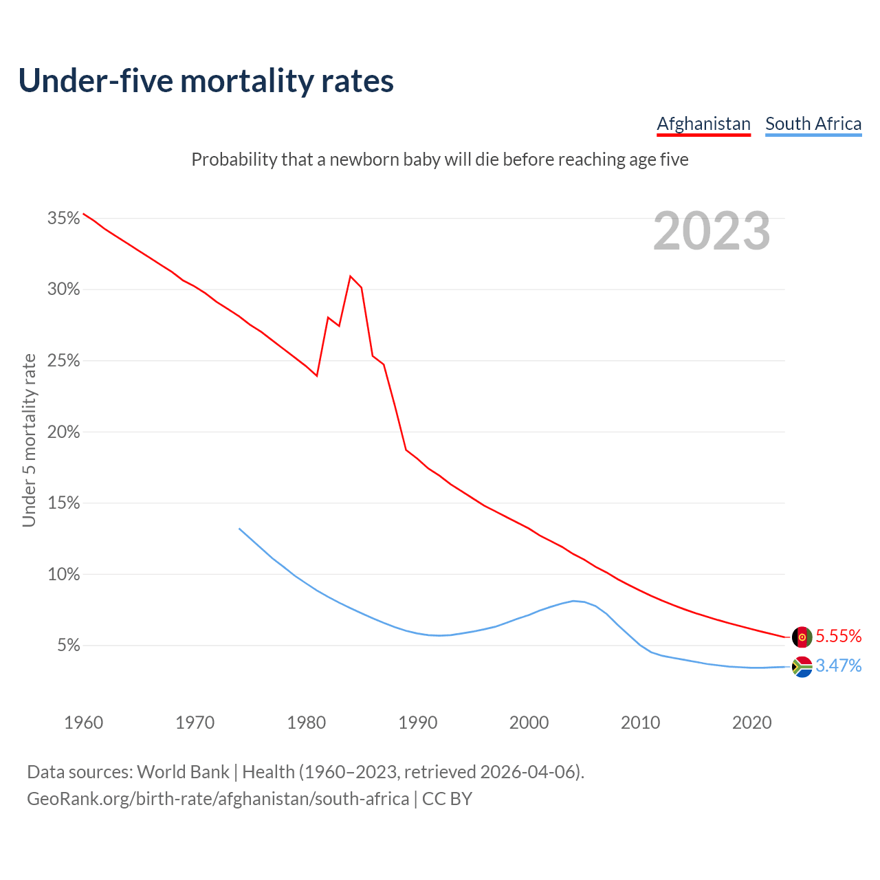 The chance that a newborn baby will die before reaching age five is 5.55% in Afghanistan and 3.47% in South Africa. Above is a chart with historical data on under-five mortality rates.