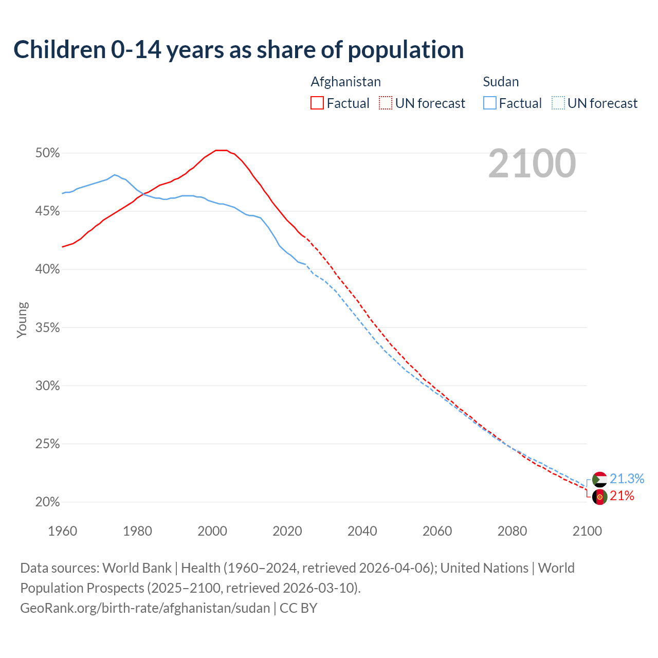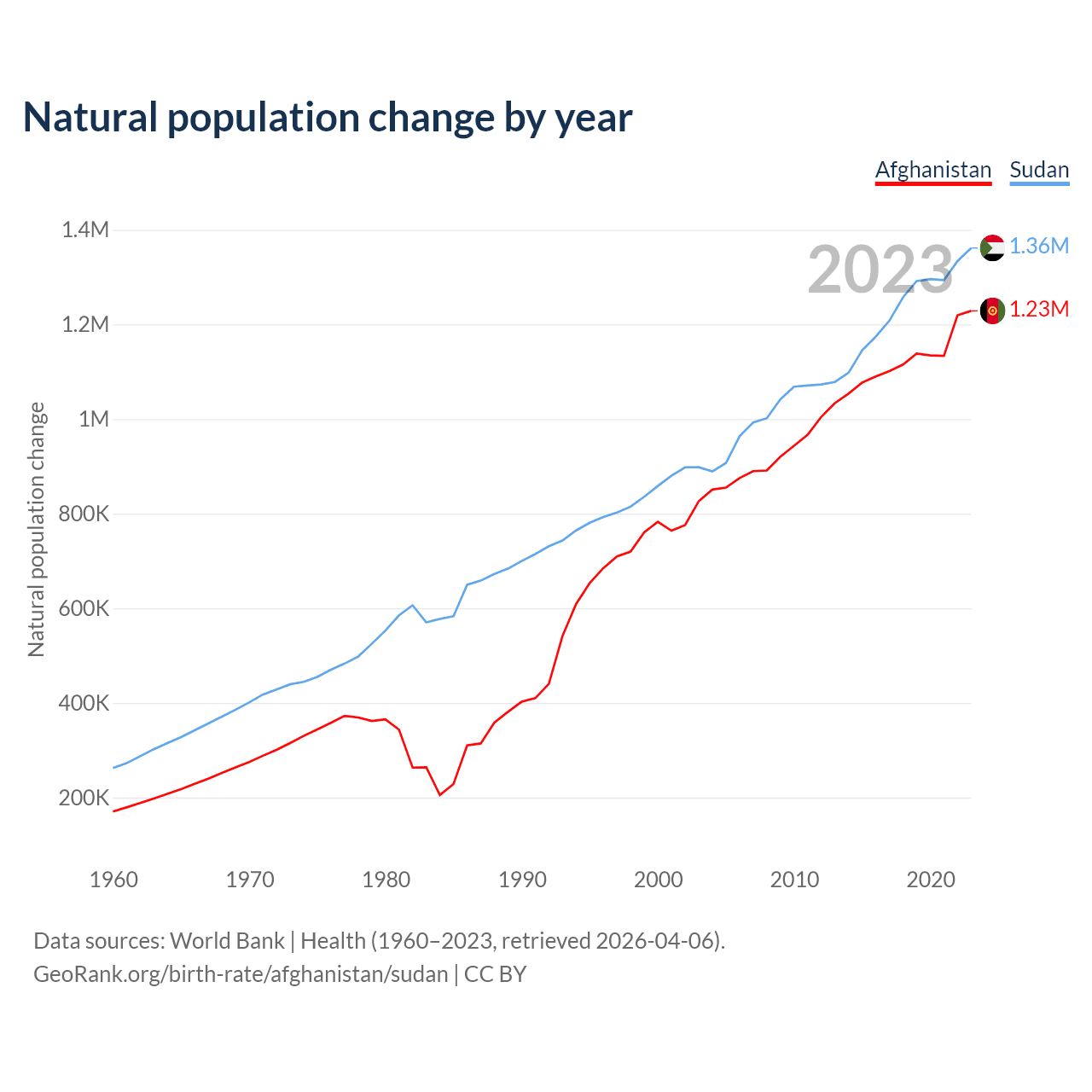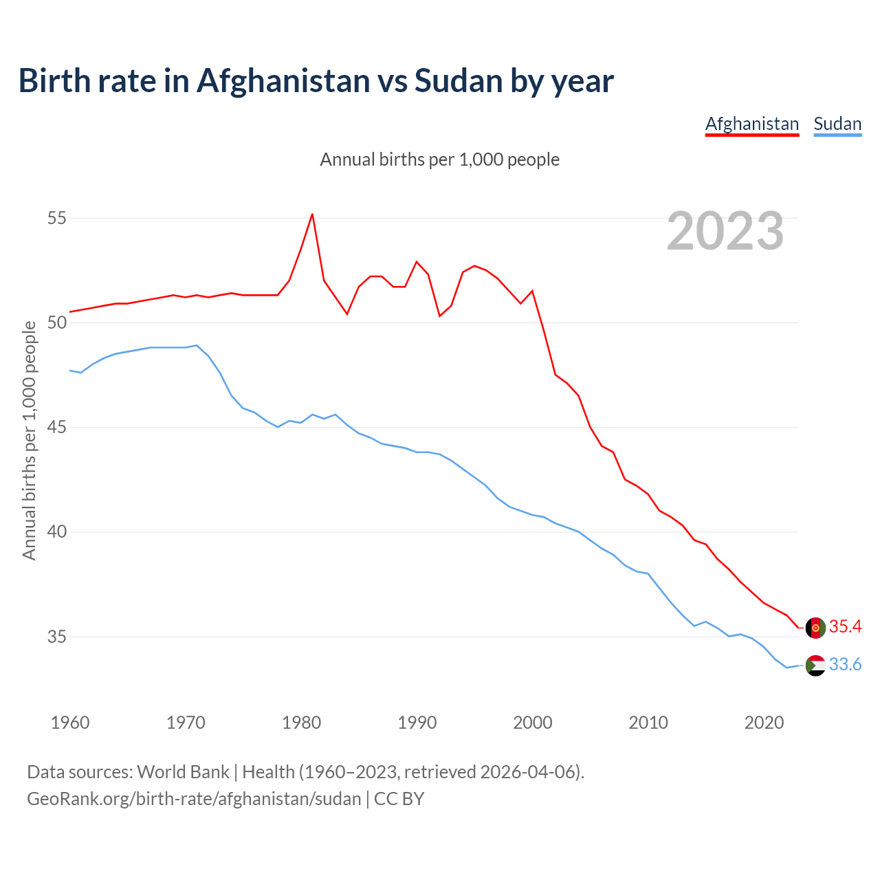 Afghanistan has an annual birth rate of 35.4 births per 1,000 people, compared to 33.6 for Sudan. The average number of children a woman is expected to have during her lifetime — the fertility rate, is 4.84 in Afghanistan and 4.32 in Sudan — 10.7% difference.