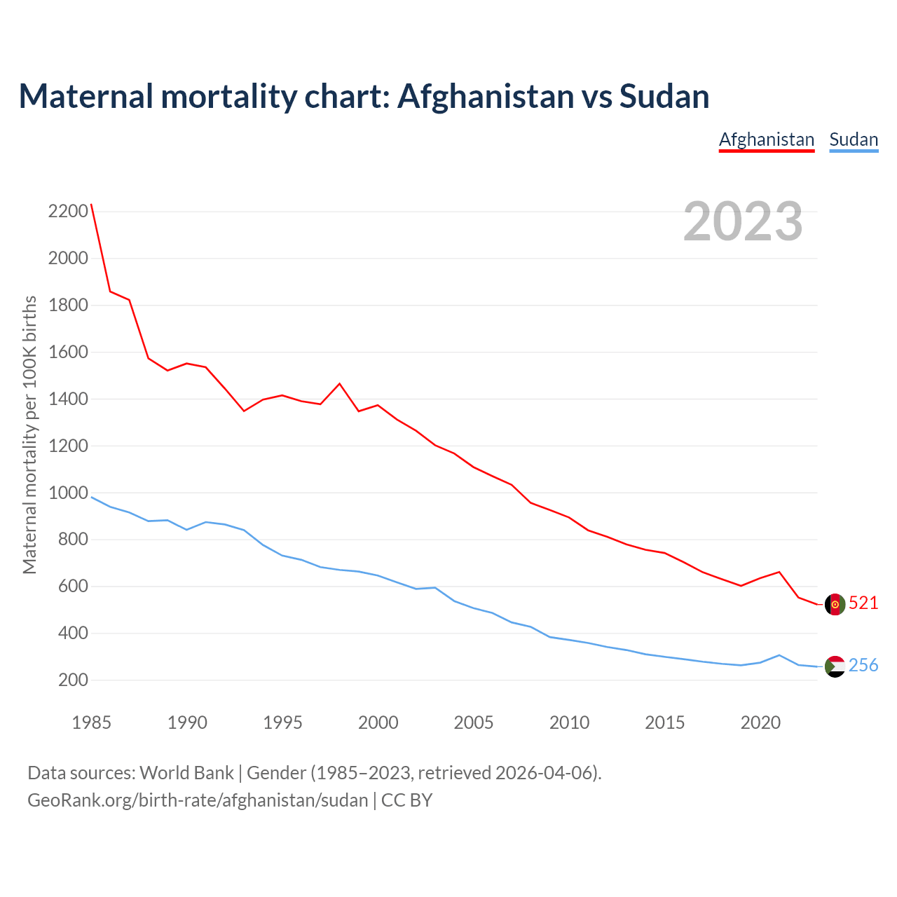 The maternal mortality rate, which is the probability of dying during childbirth or within 42 days of pregnancy termination, is 521 deaths per 100,000 live births in Afghanistan, compared to 256 deaths in Sudan.
