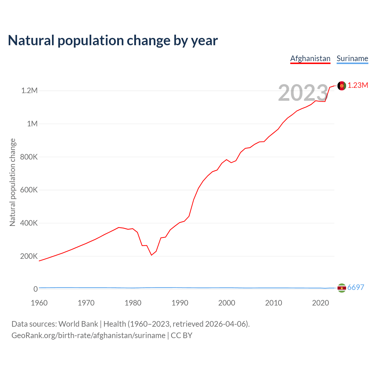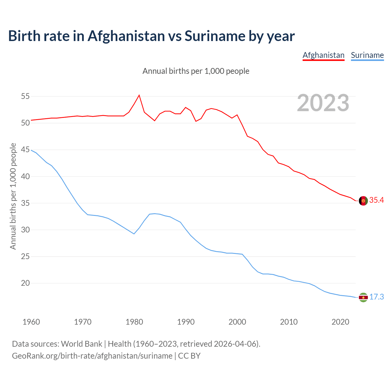 Afghanistan has an annual birth rate of 35.4 births per 1,000 people, compared to 17.3 for Suriname. The average number of children a woman is expected to have during her lifetime — the fertility rate, is 4.84 in Afghanistan and 2.25 in Suriname — 53.5% difference.