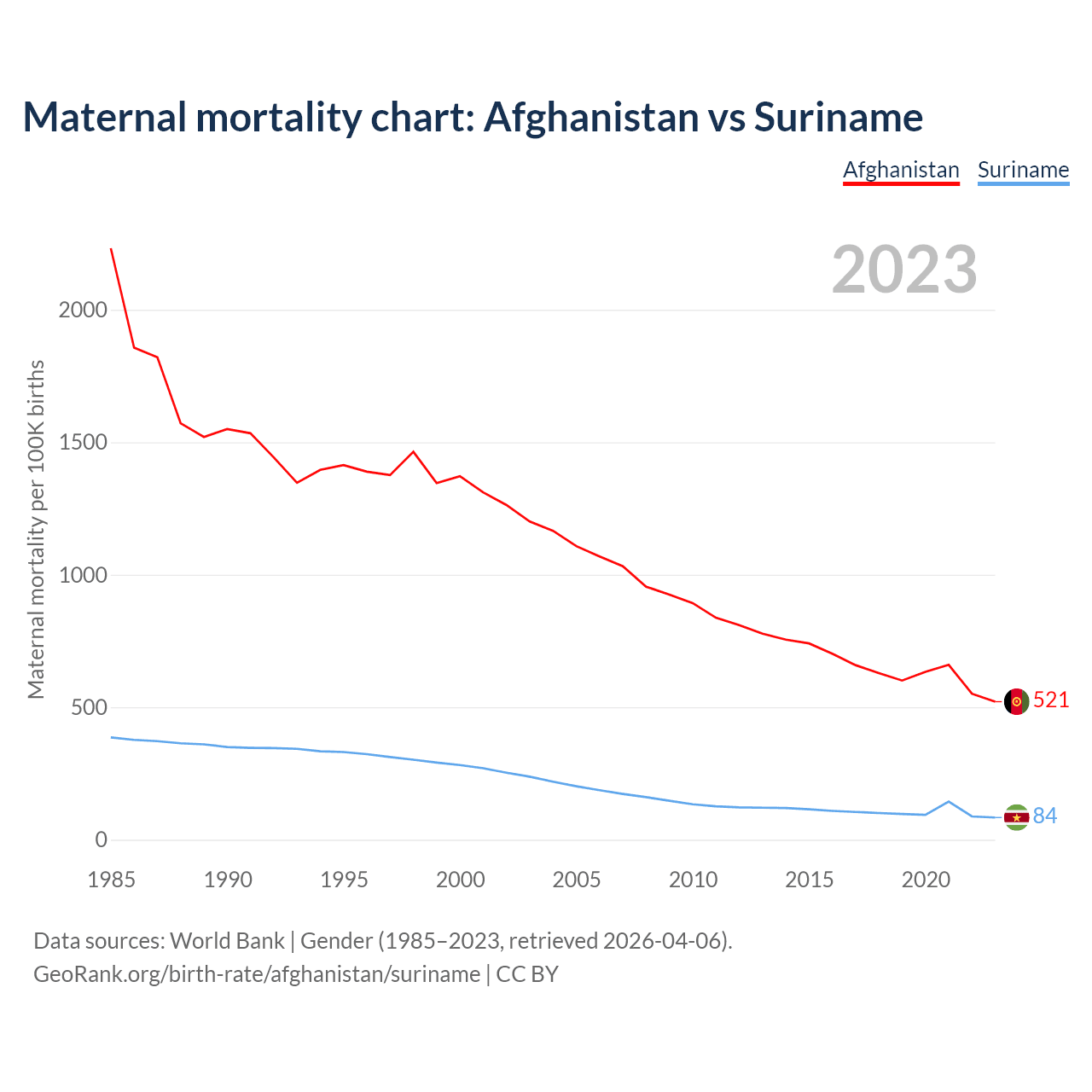 - Annual births per 1,000 women ages 15-19 (adolescent birth rate or teenage mother rate) is 64.1 in Afghanistan vs 48 in Suriname.