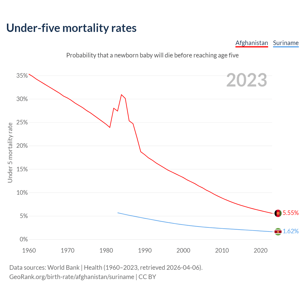 The chance that a newborn baby will die before reaching age five is 5.55% in Afghanistan and 1.62% in Suriname. Above is a chart with historical data on under-five mortality rates.