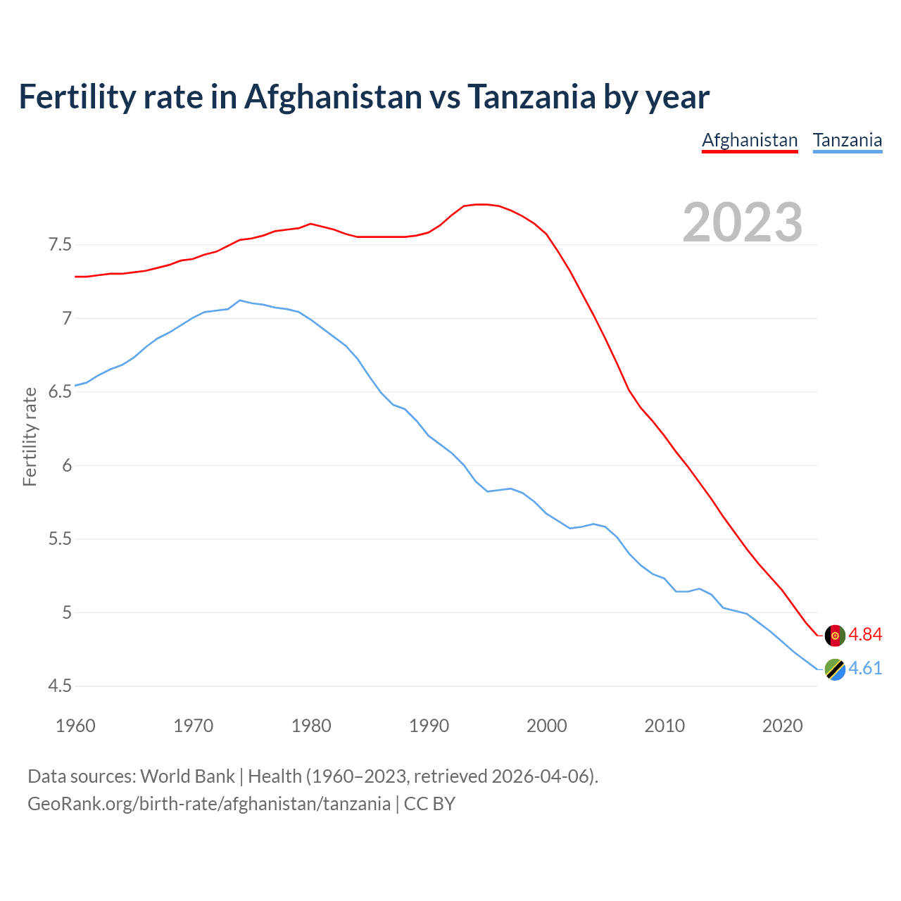 1960 vs 2023, the fertility rate has decreased by 33.5% in Afghanistan and by 29.5% in Tanzania — in 1960, it was 7.28 and 6.54, respectively.