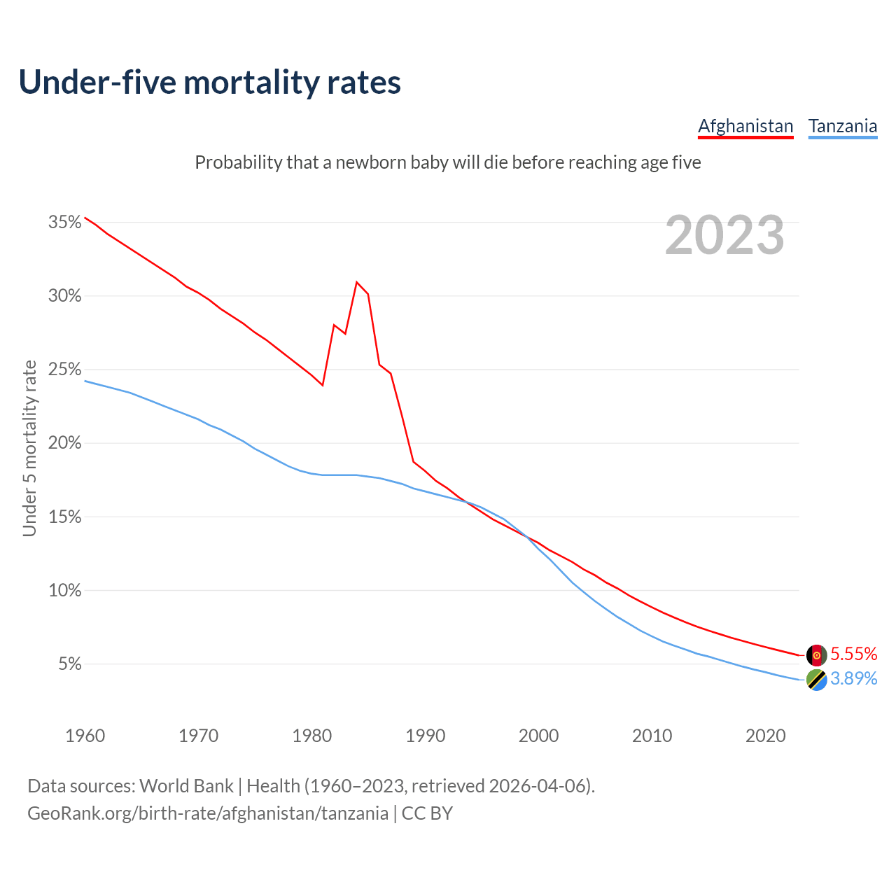 The chance that a newborn baby will die before reaching age five is 5.55% in Afghanistan and 3.89% in Tanzania. Above is a chart with historical data on under-five mortality rates.