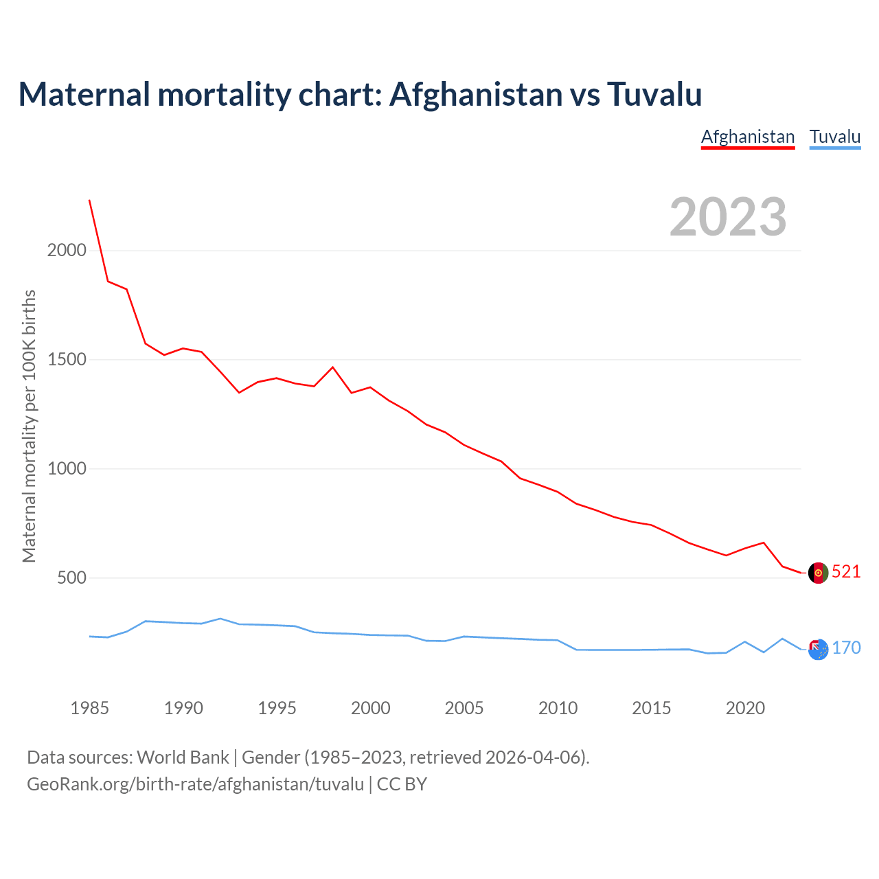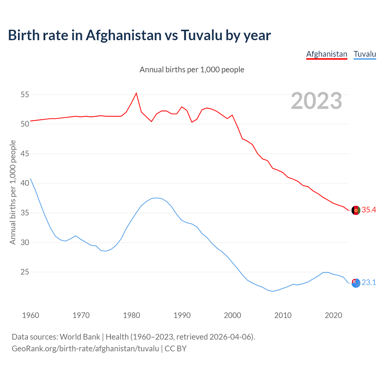 Afghanistan has an annual birth rate of 35.4 births per 1,000 people, compared to 23.1 for Tuvalu. The average number of children a woman is expected to have during her lifetime — the fertility rate, is 4.84 in Afghanistan and 3.21 in Tuvalu — 33.7% difference.