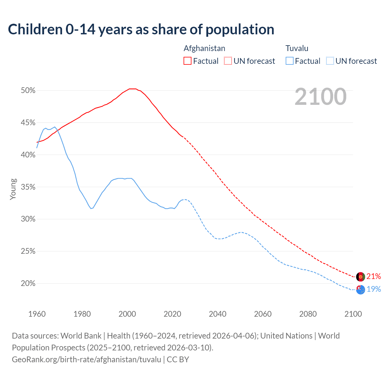 According to the latest available data on birth rates, the fertility rate in Afghanistan was 4.84 children per woman in 2023, compared to 3.21 in Tuvalu in 2023. The replacement level is considered to be 2.1 children per woman.