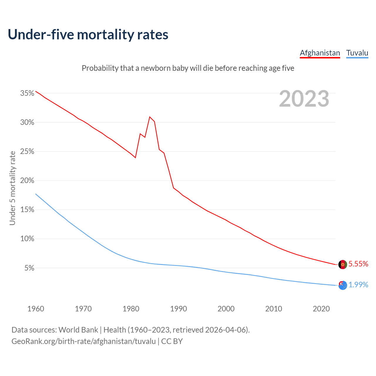 The chance that a newborn baby will die before reaching age five is 5.55% in Afghanistan and 1.99% in Tuvalu. Above is a chart with historical data on under-five mortality rates.