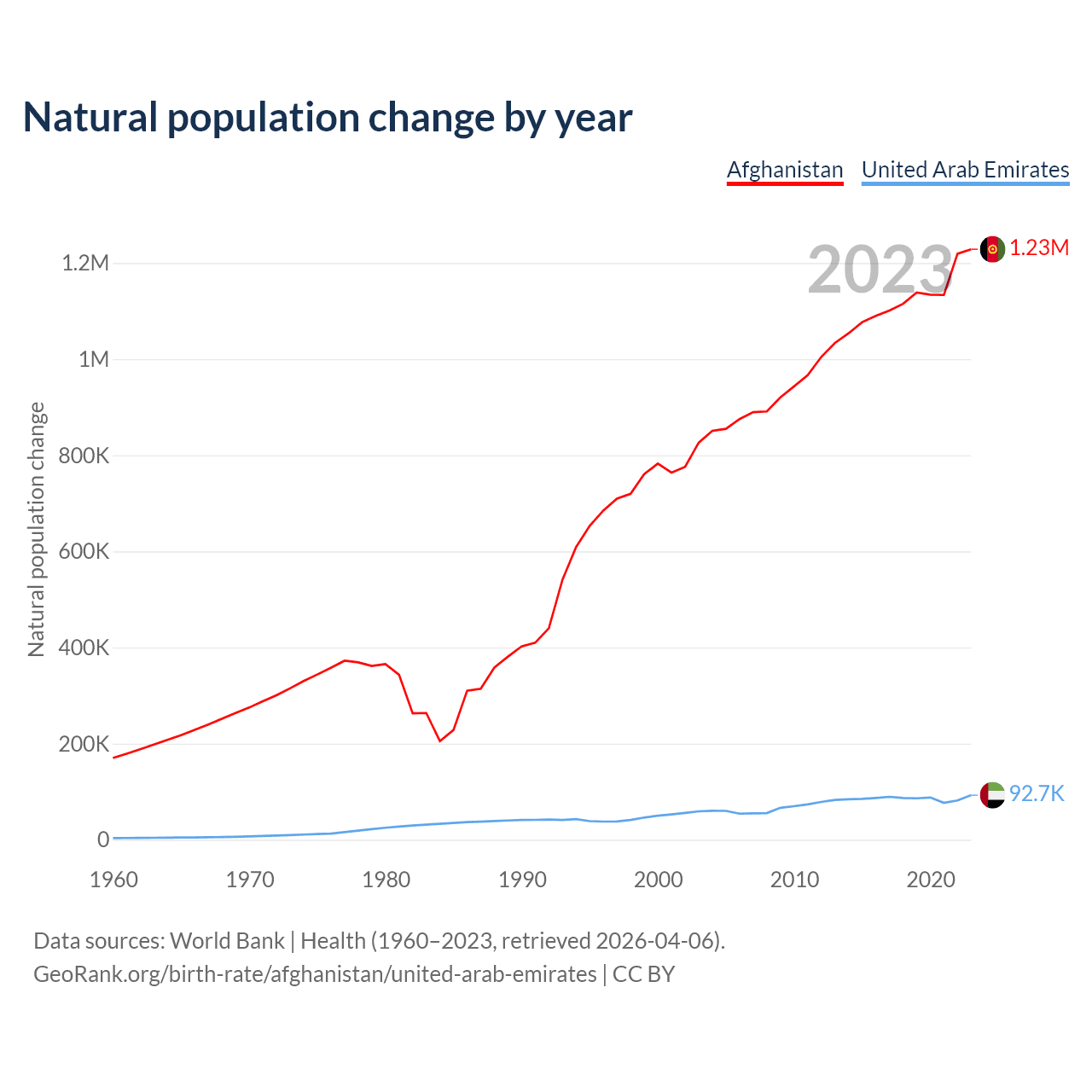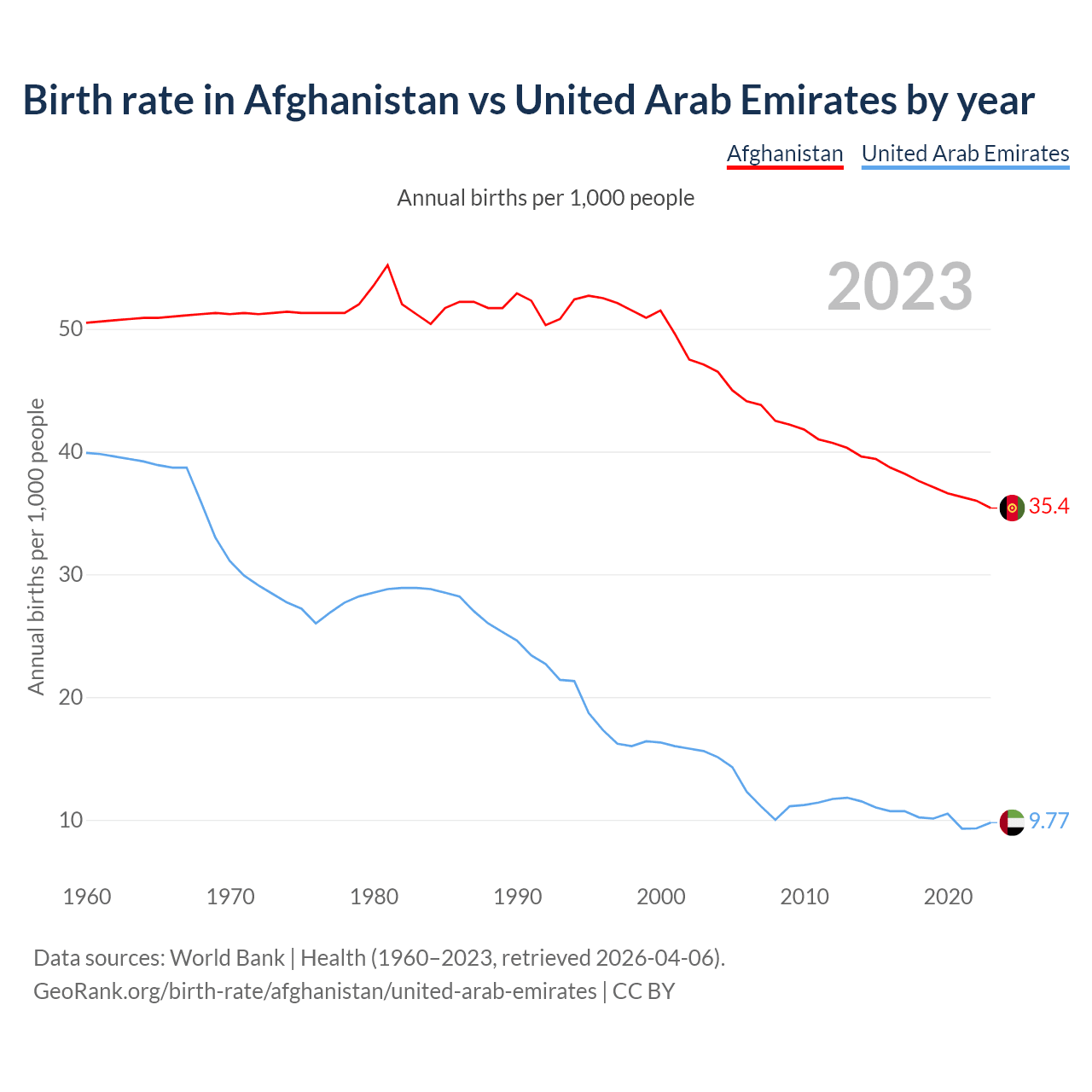 Afghanistan has an annual birth rate of 35.4 births per 1,000 people, compared to 9.77 for the United Arab Emirates. The average number of children a woman is expected to have during her lifetime — the fertility rate, is 4.84 in Afghanistan and 1.2 in the United Arab Emirates — 75.2% difference.