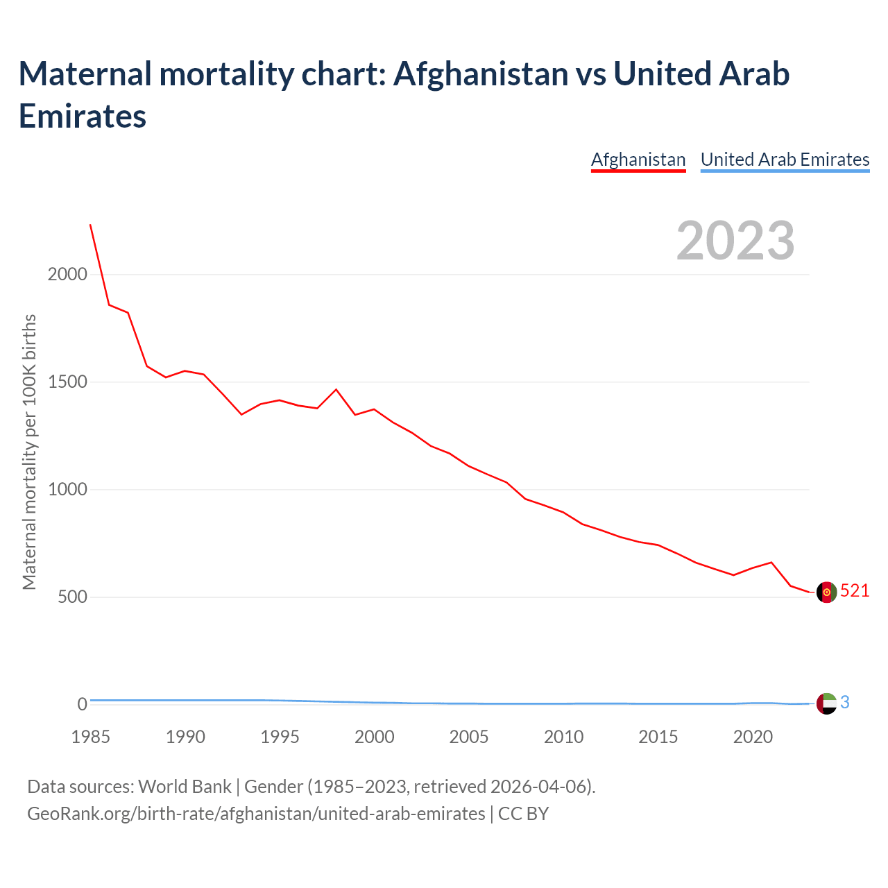 The maternal mortality rate, which is the probability of dying during childbirth or within 42 days of pregnancy termination, is 521 deaths per 100,000 live births in Afghanistan, compared to 3 deaths in the United Arab Emirates.