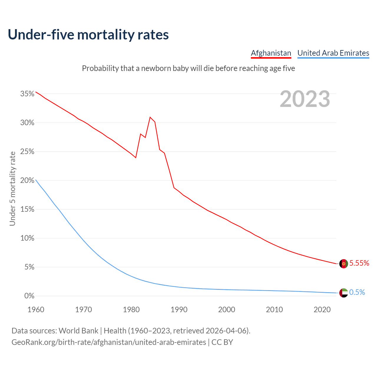The chance that a newborn baby will die before reaching age five is 5.55% in Afghanistan and 0.5% in the United Arab Emirates. Above is a chart with historical data on under-five mortality rates.