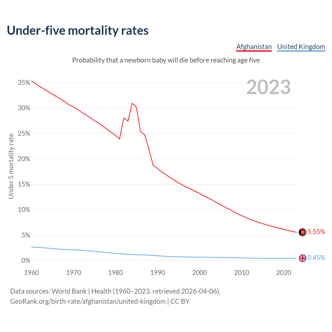 The chance that a newborn baby will die before reaching age five is 5.55% in Afghanistan and 0.45% in the United Kingdom. Above is a chart with historical data on under-five mortality rates.