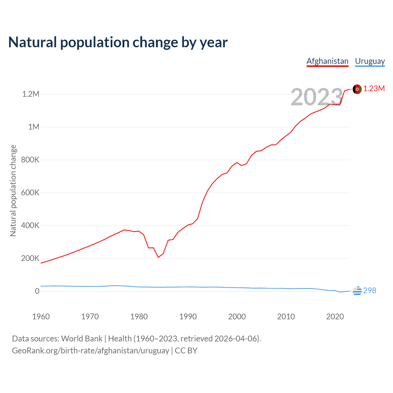 Afghanistan has an annual birth rate of 35.4 births per 1,000 people, compared to 9.87 for Uruguay. The average number of children a woman is expected to have during her lifetime — the fertility rate, is 4.84 in Afghanistan and 1.41 in Uruguay — 70.9% difference.