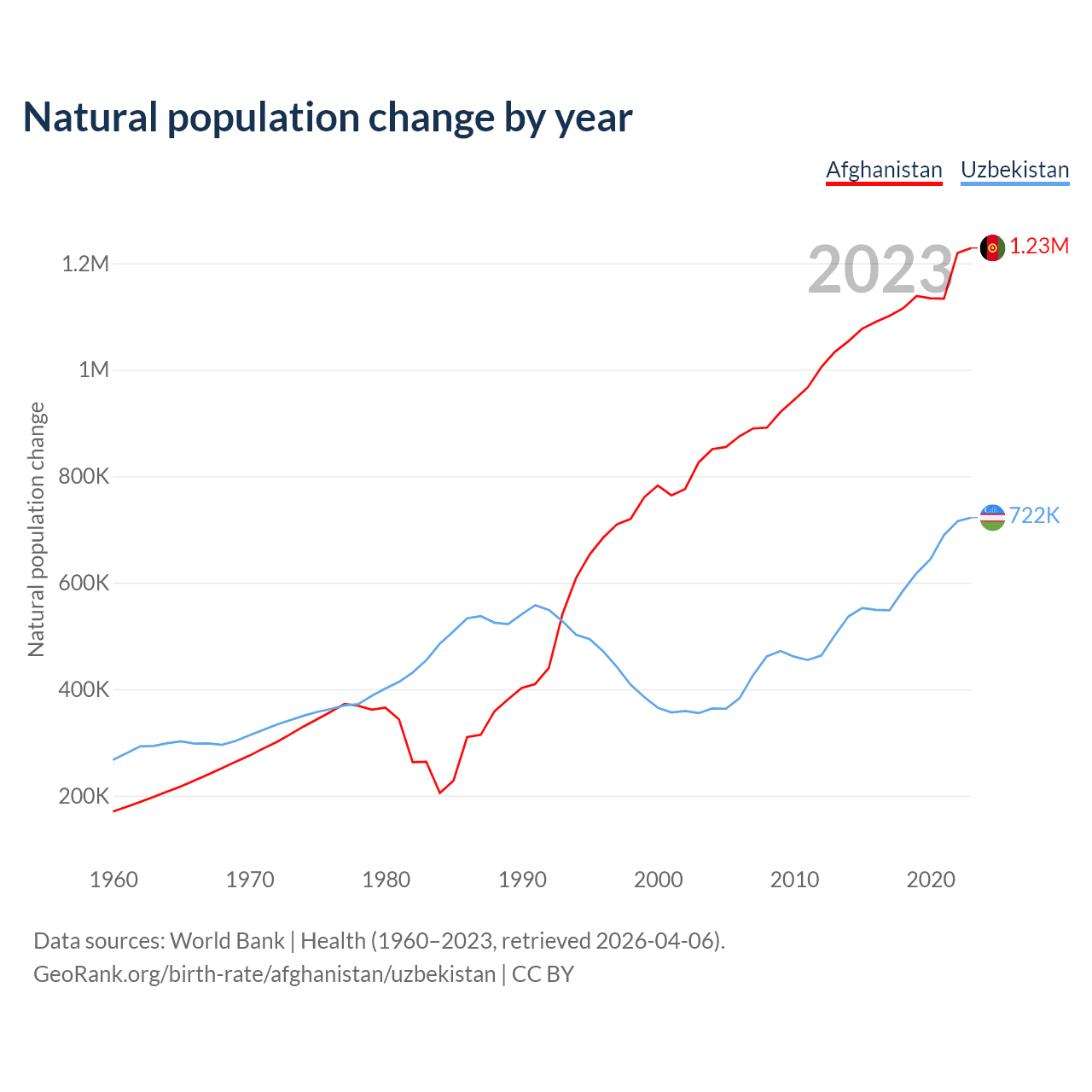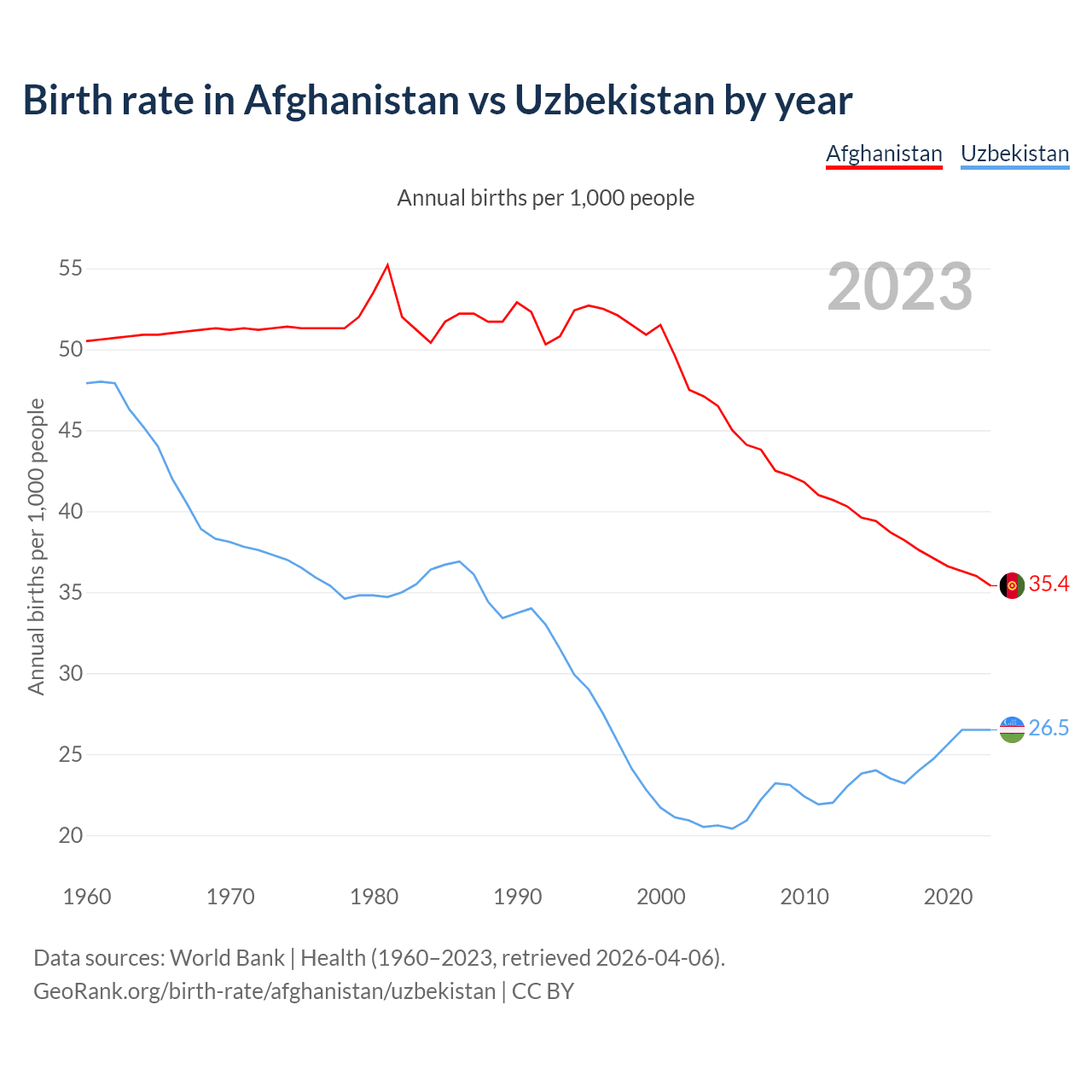 Afghanistan has an annual birth rate of 35.4 births per 1,000 people, compared to 26.5 for Uzbekistan. The average number of children a woman is expected to have during her lifetime — the fertility rate, is 4.84 in Afghanistan and 3.5 in Uzbekistan — 27.7% difference.