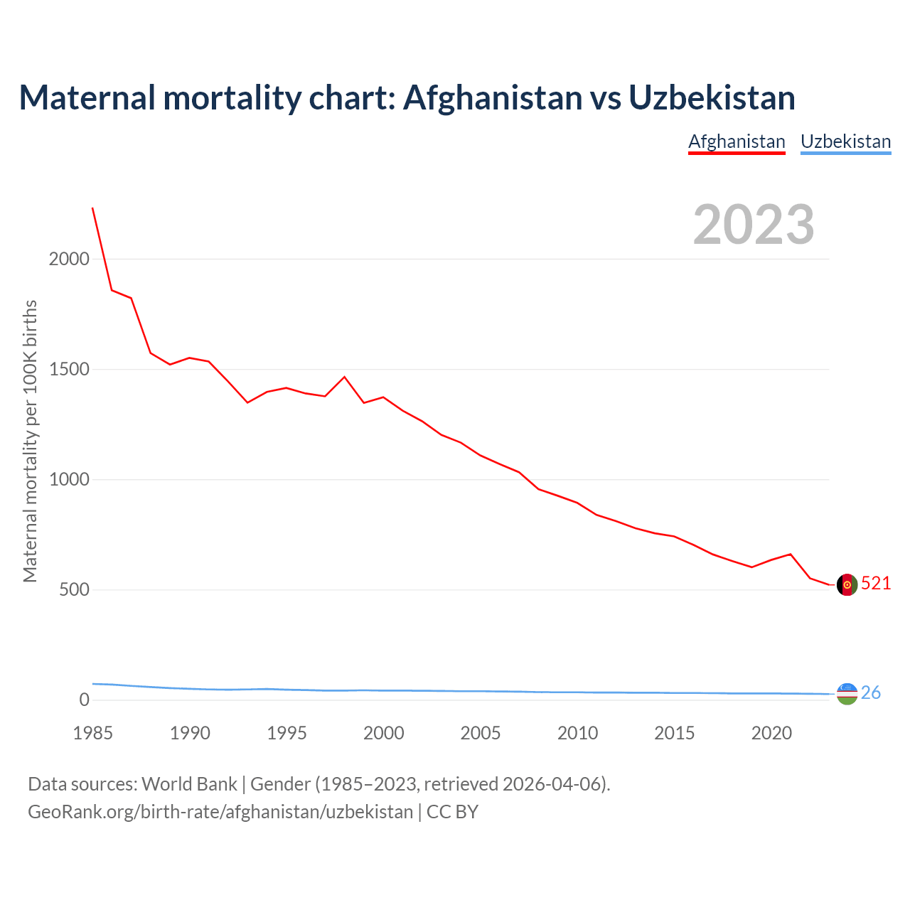 The maternal mortality rate, which is the probability of dying during childbirth or within 42 days of pregnancy termination, is 521 deaths per 100,000 live births in Afghanistan, compared to 26 deaths in Uzbekistan.