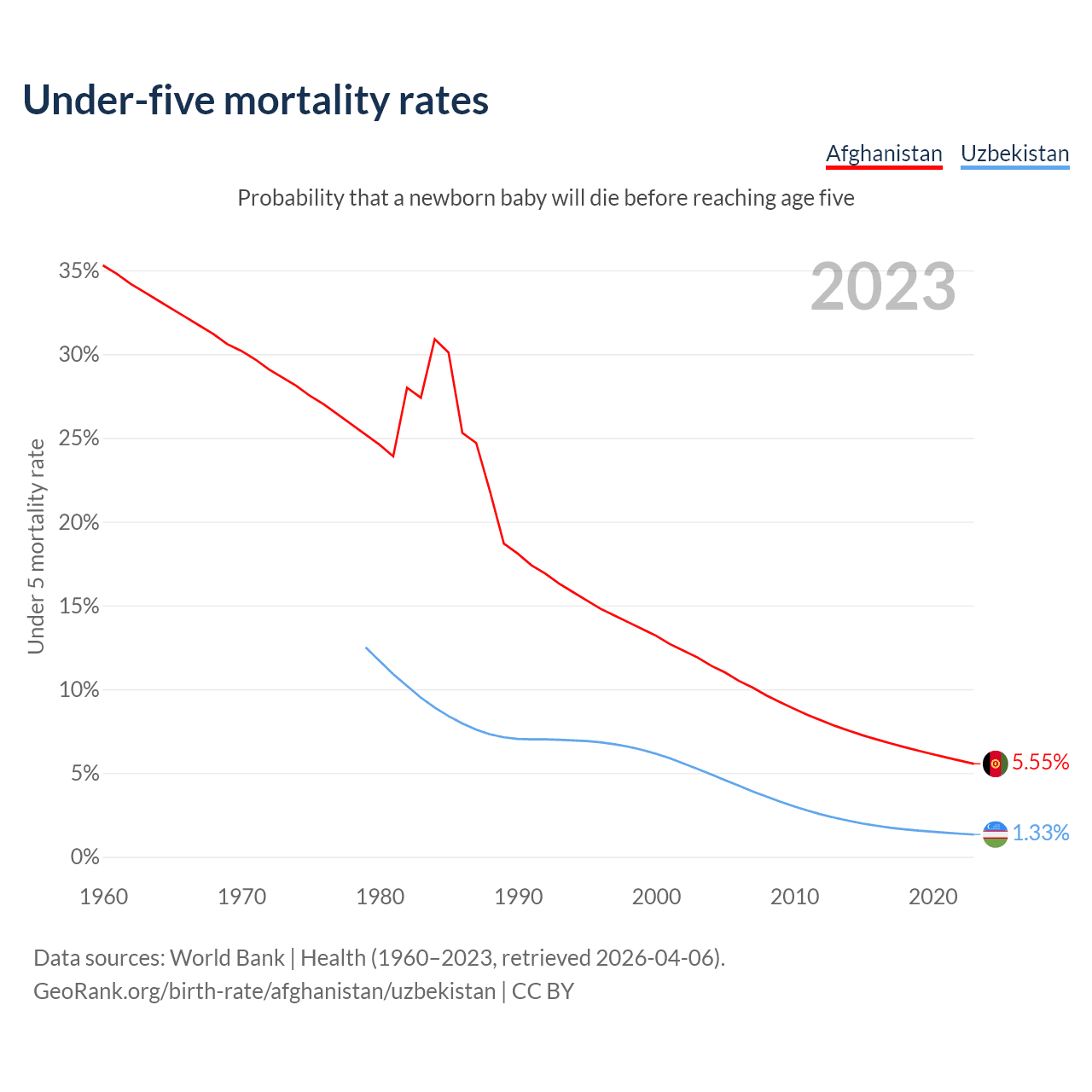 The chance that a newborn baby will die before reaching age five is 5.55% in Afghanistan and 1.33% in Uzbekistan. Above is a chart with historical data on under-five mortality rates.