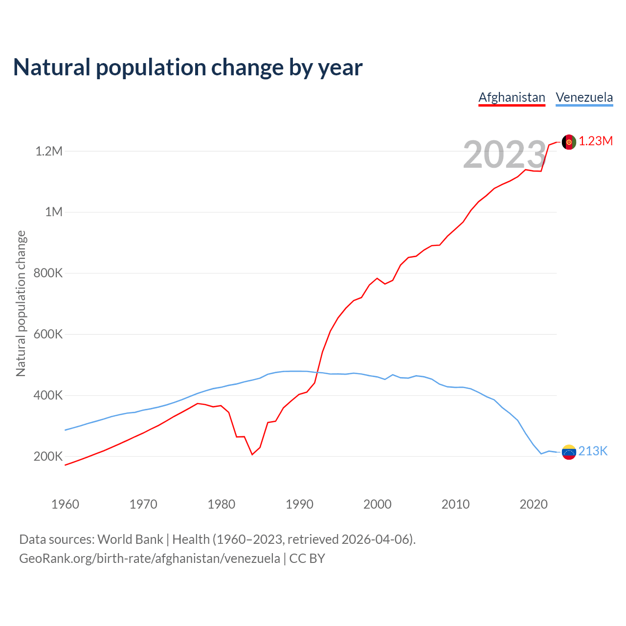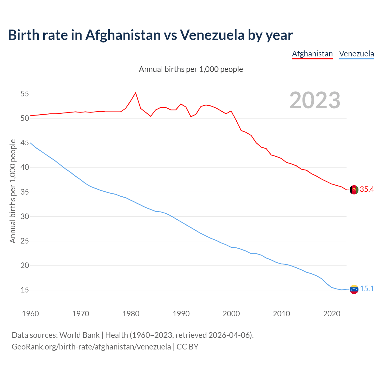 According to the latest available data on birth rates, the fertility rate in Afghanistan was 4.84 children per woman in 2023, compared to 2.08 in Venezuela in 2023. The replacement level is considered to be 2.1 children per woman.