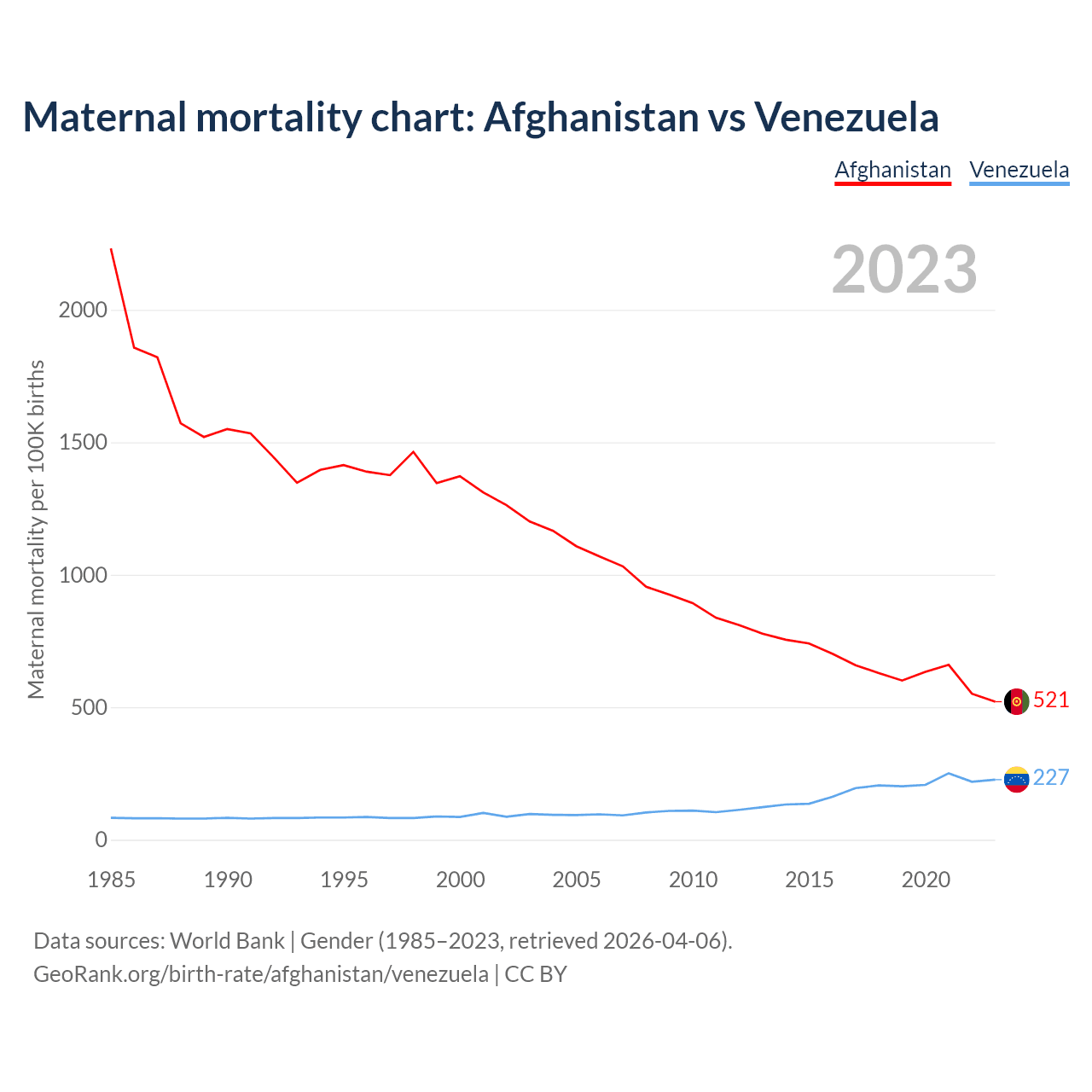 The maternal mortality rate, which is the probability of dying during childbirth or within 42 days of pregnancy termination, is 521 deaths per 100,000 live births in Afghanistan, compared to 227 deaths in Venezuela.