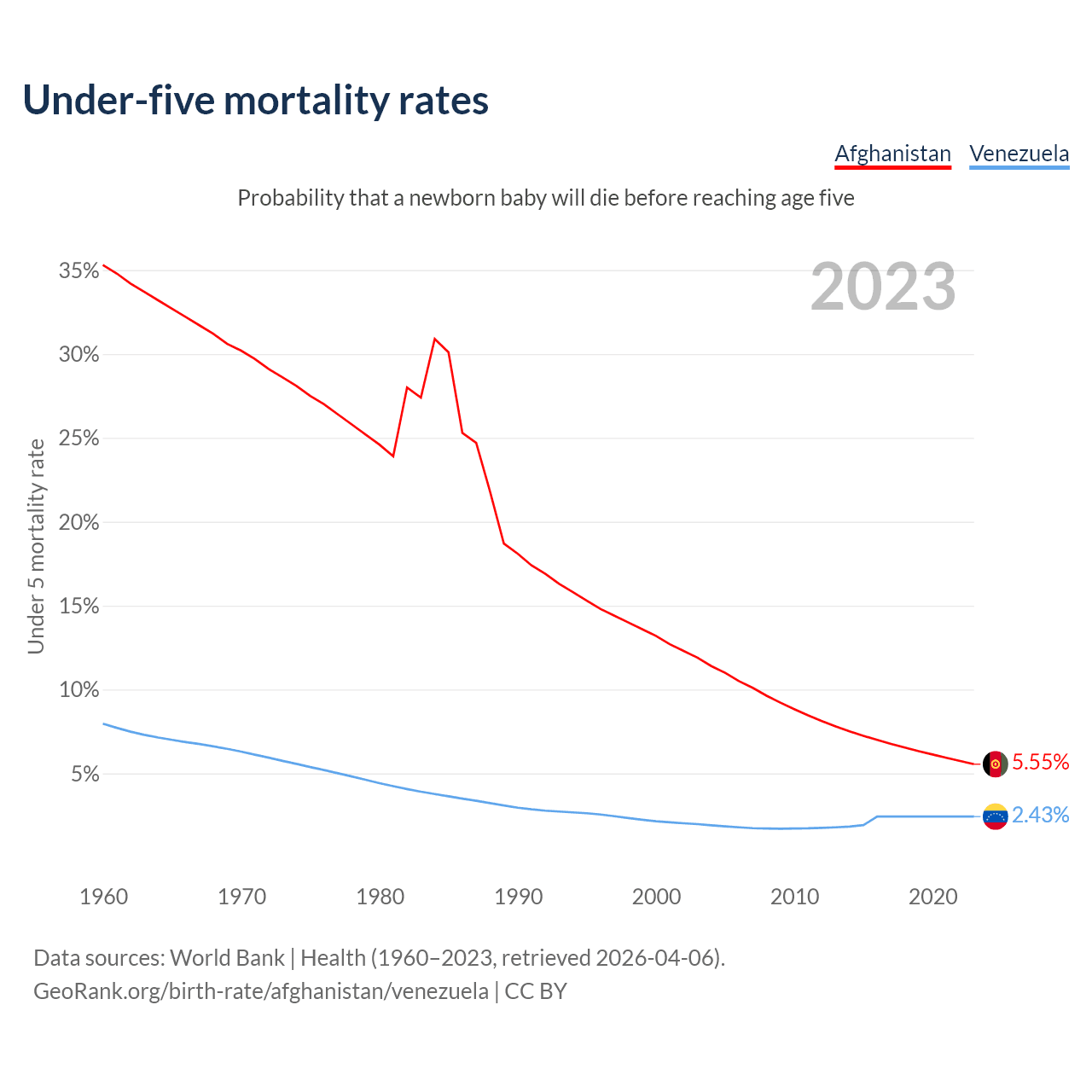The chance that a newborn baby will die before reaching age five is 5.55% in Afghanistan and 2.43% in Venezuela. Above is a chart with historical data on under-five mortality rates.