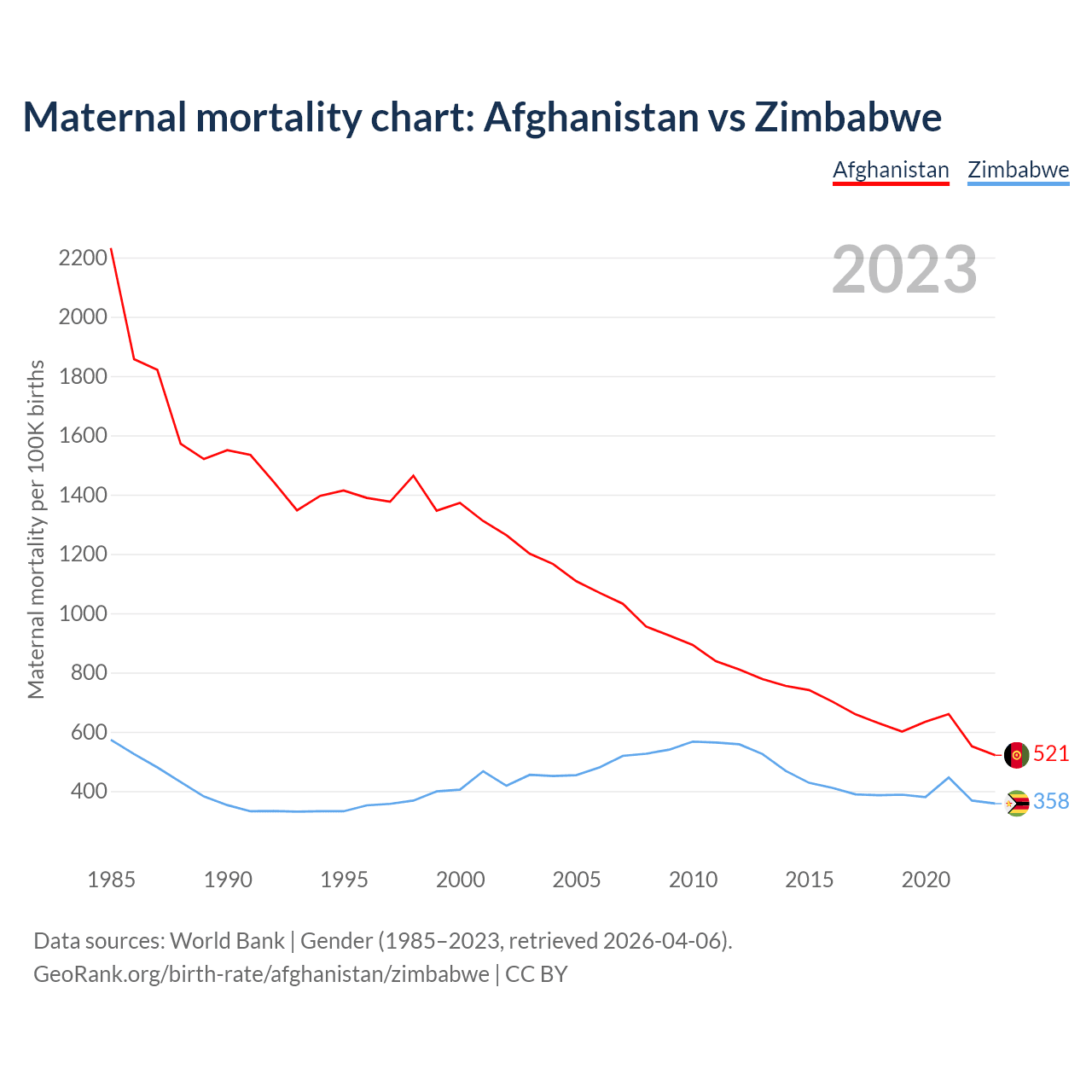 The maternal mortality rate, which is the probability of dying during childbirth or within 42 days of pregnancy termination, is 521 deaths per 100,000 live births in Afghanistan, compared to 358 deaths in Zimbabwe.