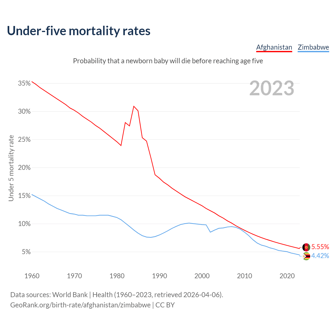 The chance that a newborn baby will die before reaching age five is 5.55% in Afghanistan and 4.42% in Zimbabwe. Above is a chart with historical data on under-five mortality rates.
