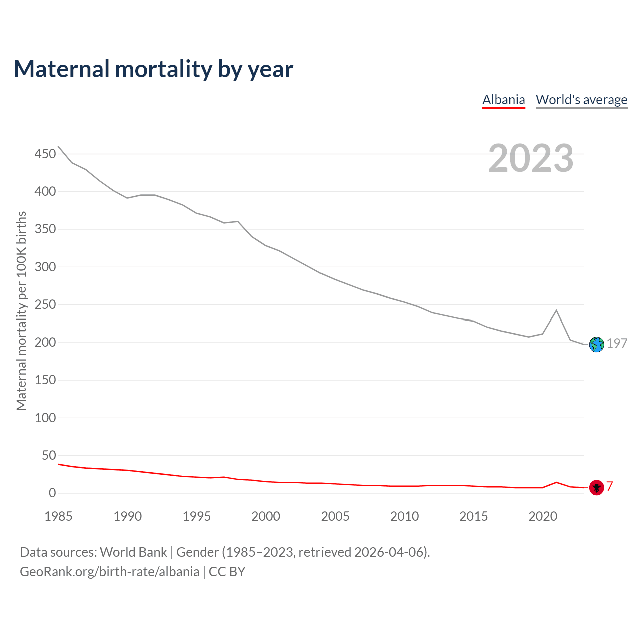 The maternal mortality rate in Albania was 7 deaths per 100,000 live births in 2023 — a 0.007% chance of dying during childbirth or within 42 days of pregnancy termination. This is a 53.3% decrease compared to the year 2000.