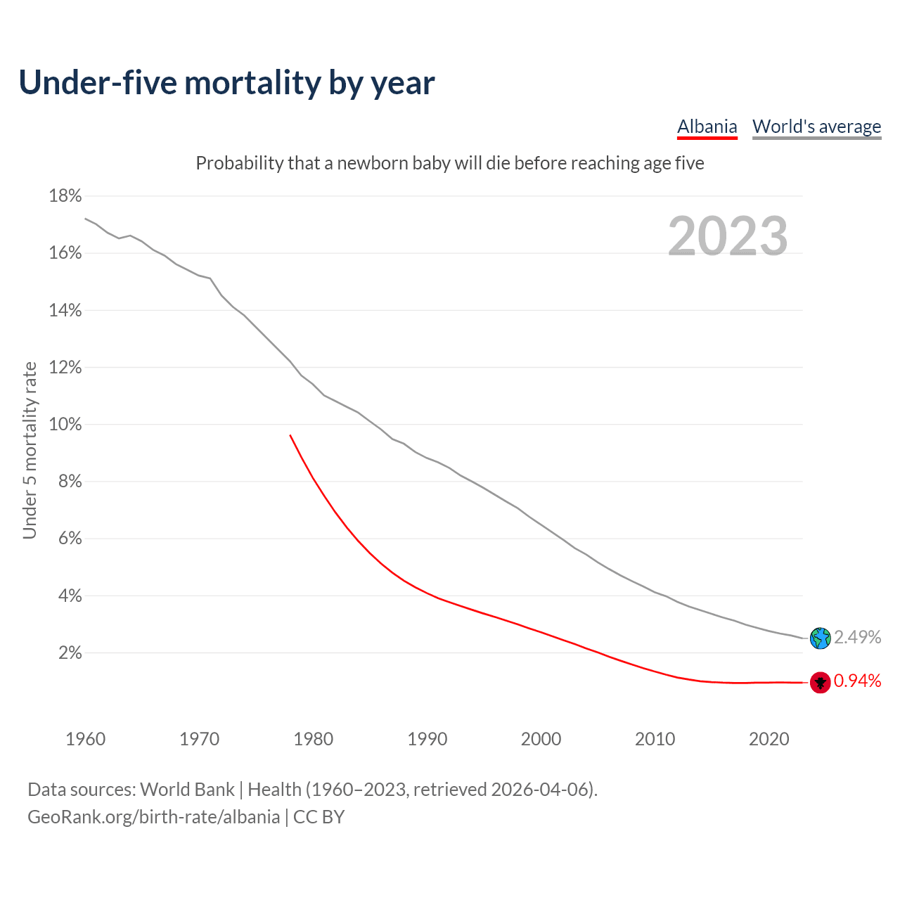 The under-5 mortality rate in Albania was 9.4 deaths per 1,000 live births in 2023 — a 0.94% chance that a newborn baby will die before reaching age five. This is down from 27.1 deaths per 1,000 live births in 2000.