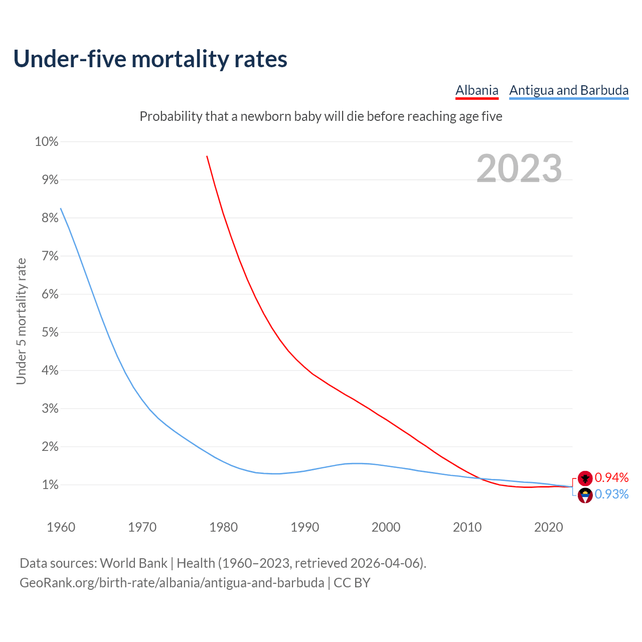 The chance that a newborn baby will die before reaching age five is 0.94% in Albania and 0.93% in Antigua and Barbuda. Above is a chart with historical data on under-five mortality rates.
