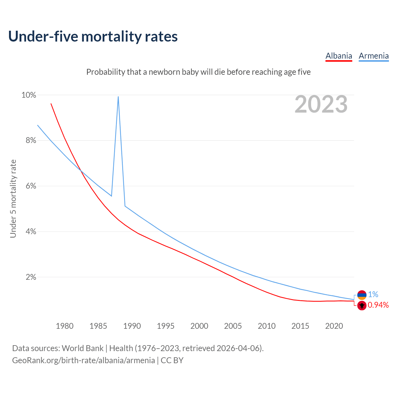 The chance that a newborn baby will die before reaching age five is 0.94% in Albania and 1% in Armenia. Above is a chart with historical data on under-five mortality rates.