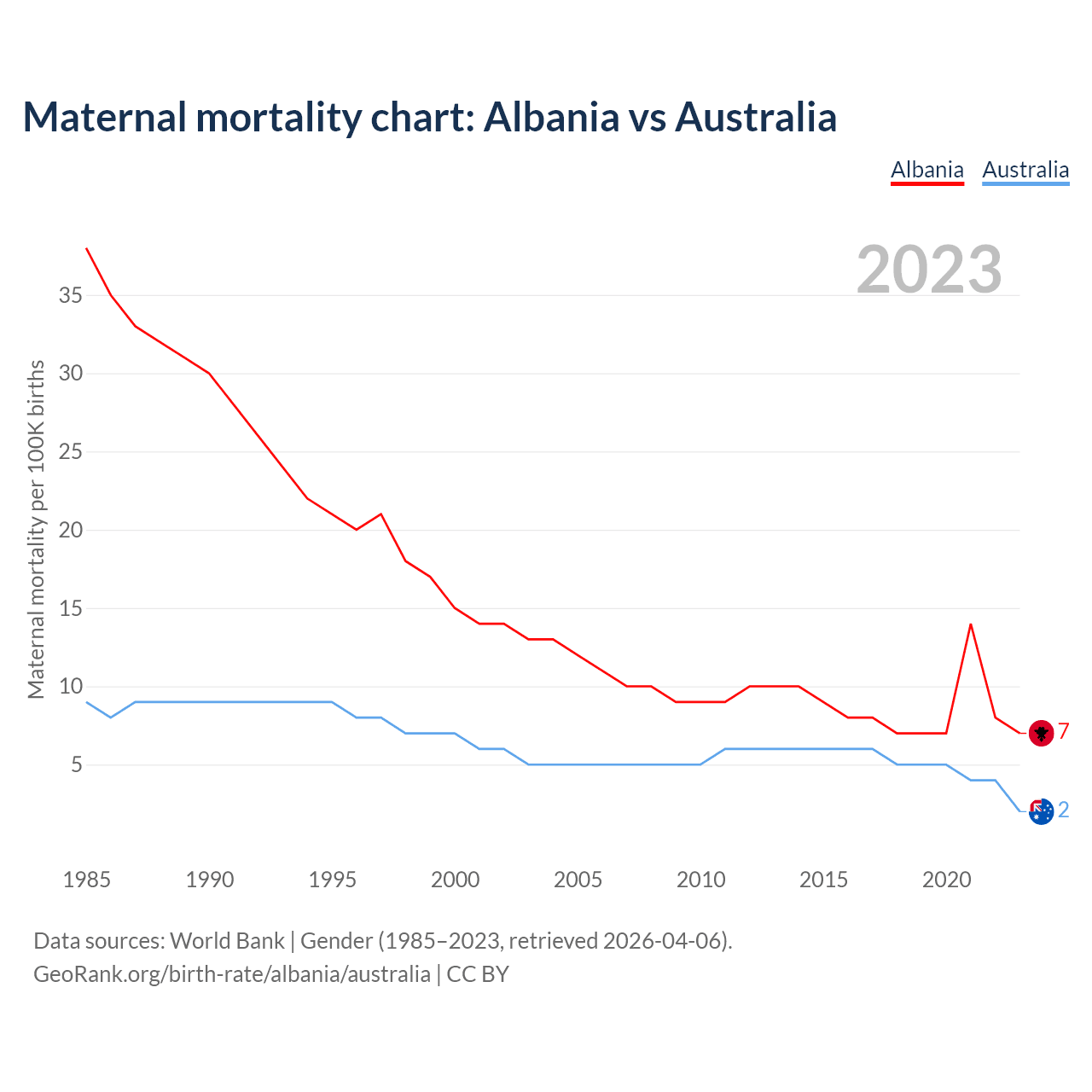 The maternal mortality rate, which is the probability of dying during childbirth or within 42 days of pregnancy termination, is 7 deaths per 100,000 live births in Albania, compared to 2 deaths in Australia.