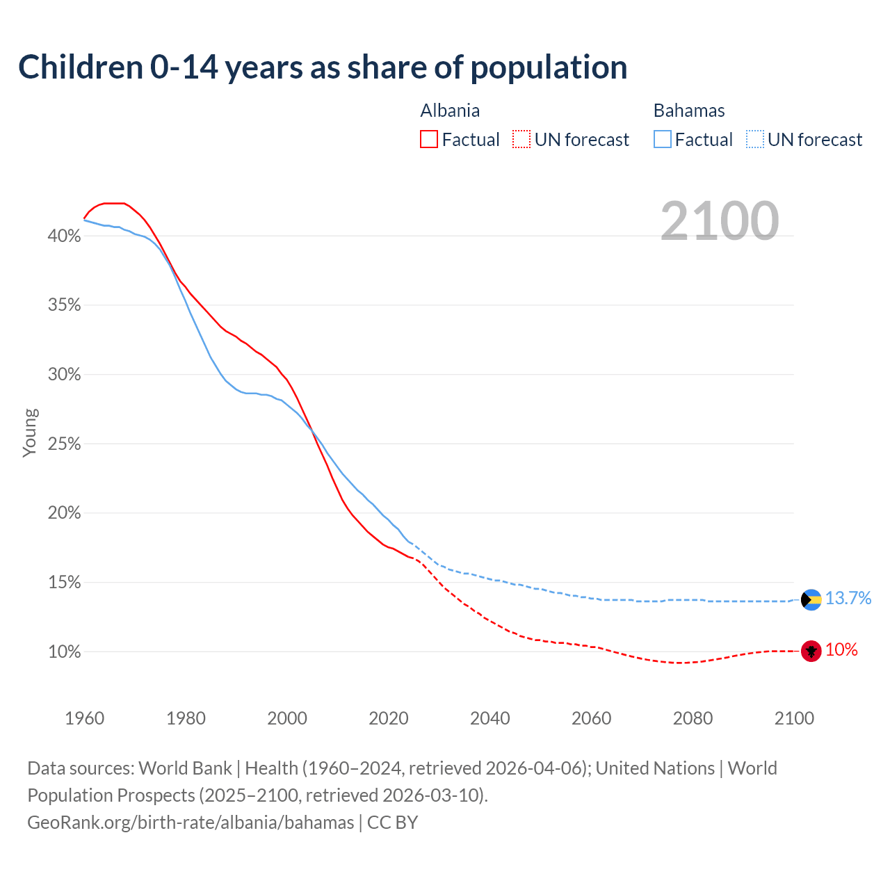 According to the latest available data on birth rates, the fertility rate in Albania was 1.35 children per woman in 2023, compared to 1.37 in the Bahamas in 2023. The replacement level is considered to be 2.1 children per woman.