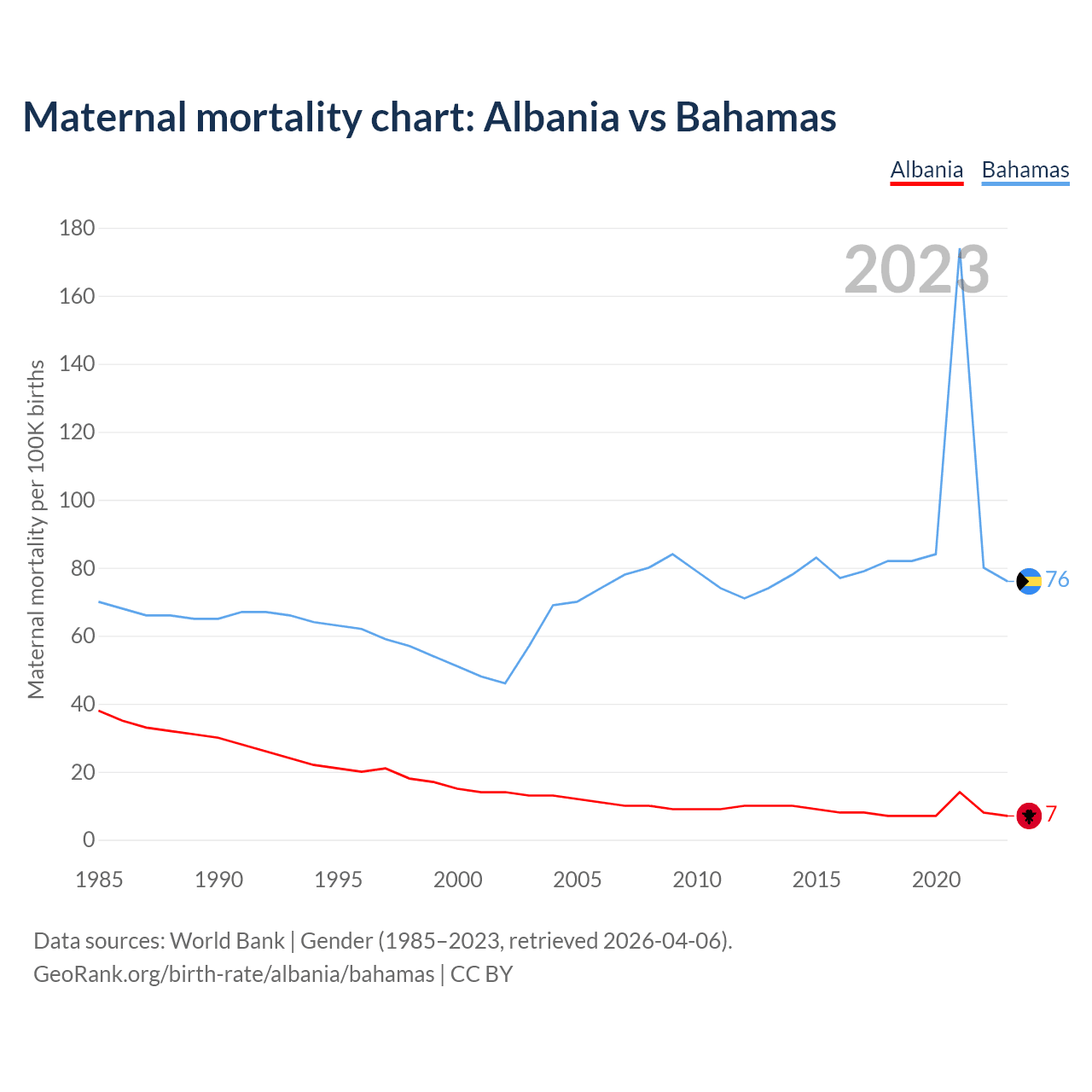 The maternal mortality rate, which is the probability of dying during childbirth or within 42 days of pregnancy termination, is 7 deaths per 100,000 live births in Albania, compared to 76 deaths in the Bahamas.
