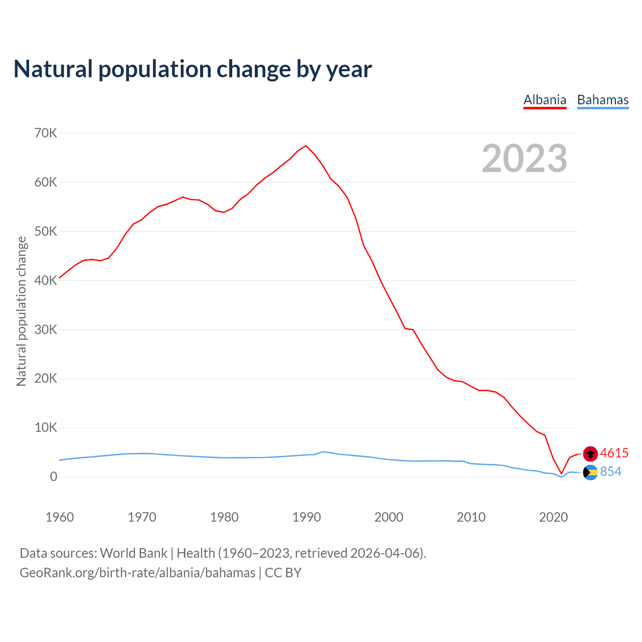 Albania has an annual birth rate of 10.2 births per 1,000 people, compared to 10.9 for the Bahamas. The average number of children a woman is expected to have during her lifetime — the fertility rate, is 1.35 in Albania and 1.37 in the Bahamas — 1.85% difference.
