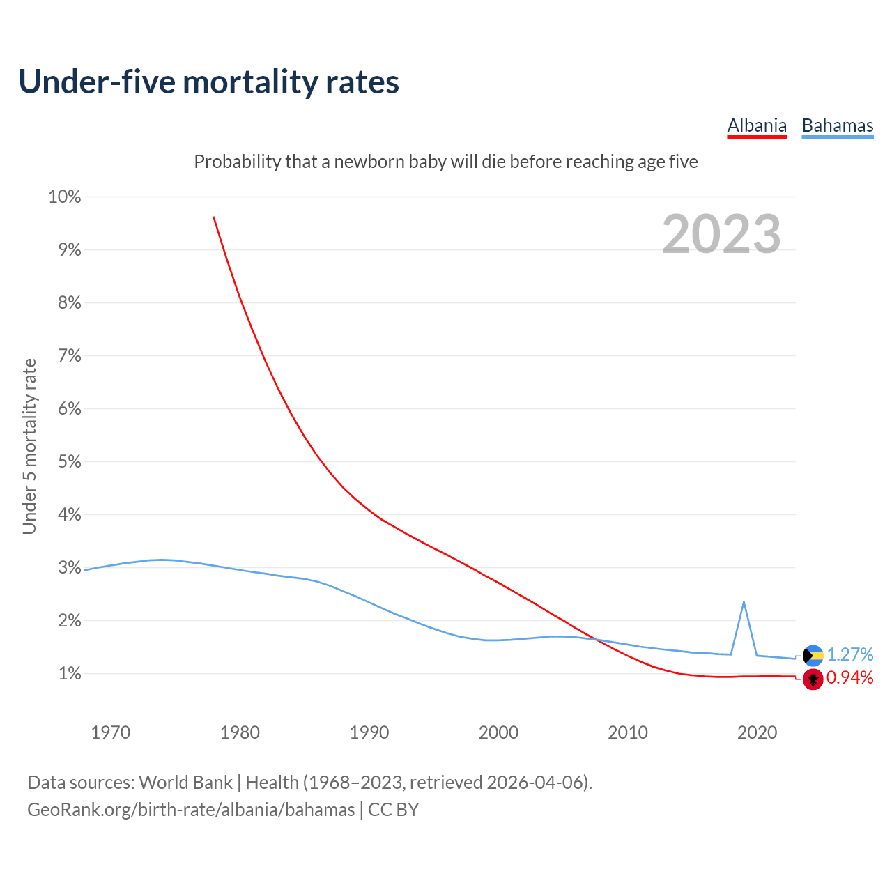 The chance that a newborn baby will die before reaching age five is 0.94% in Albania and 1.27% in the Bahamas. Above is a chart with historical data on under-five mortality rates.