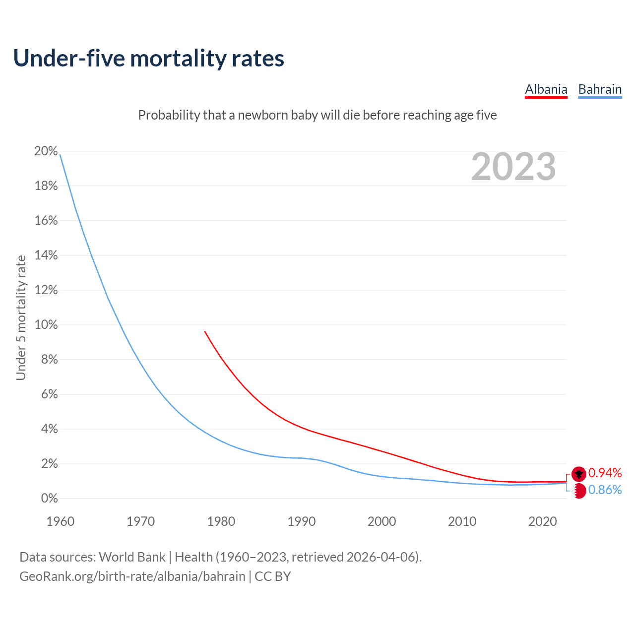 The chance that a newborn baby will die before reaching age five is 0.94% in Albania and 0.86% in Bahrain. Above is a chart with historical data on under-five mortality rates.