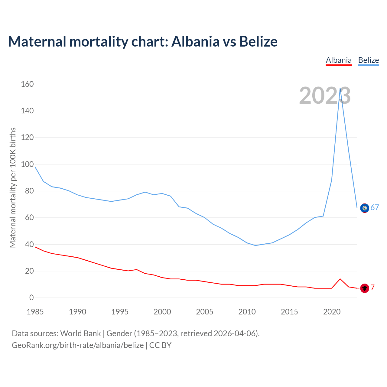 The maternal mortality rate, which is the probability of dying during childbirth or within 42 days of pregnancy termination, is 7 deaths per 100,000 live births in Albania, compared to 67 deaths in Belize.