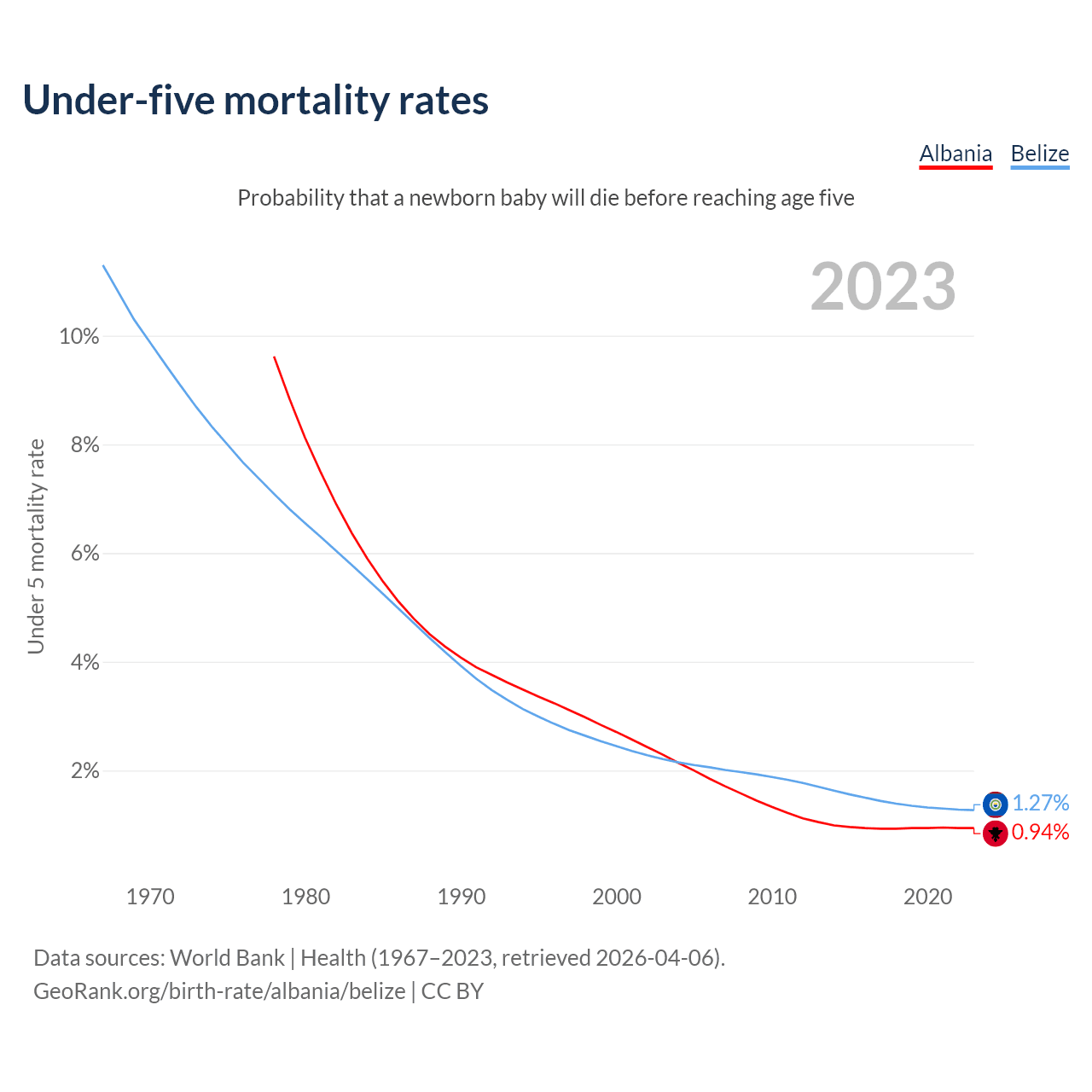 The chance that a newborn baby will die before reaching age five is 0.94% in Albania and 1.27% in Belize. Above is a chart with historical data on under-five mortality rates.