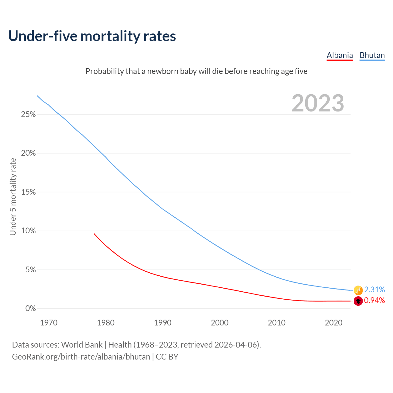 The chance that a newborn baby will die before reaching age five is 0.94% in Albania and 2.31% in Bhutan. Above is a chart with historical data on under-five mortality rates.