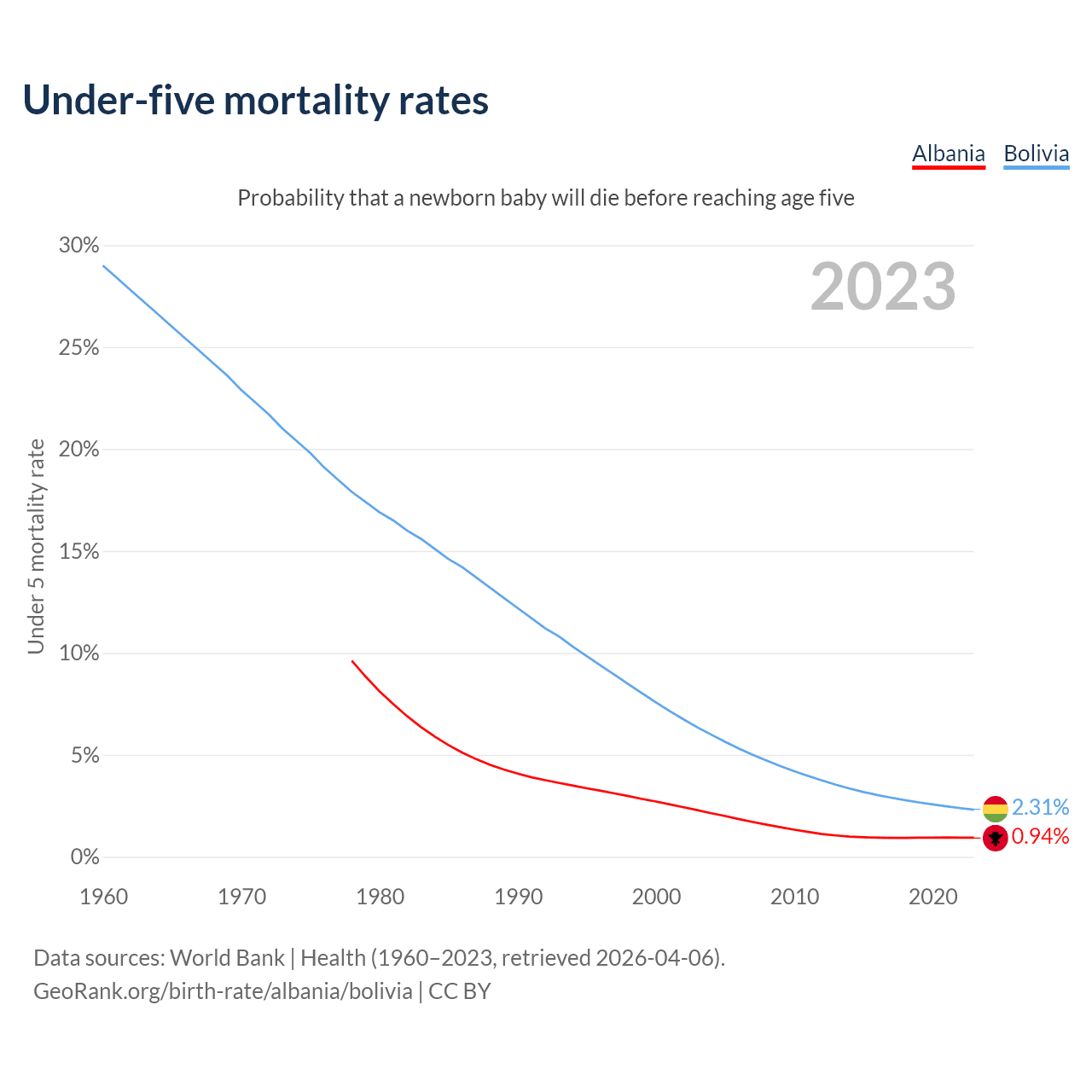 The chance that a newborn baby will die before reaching age five is 0.94% in Albania and 2.31% in Bolivia. Above is a chart with historical data on under-five mortality rates.