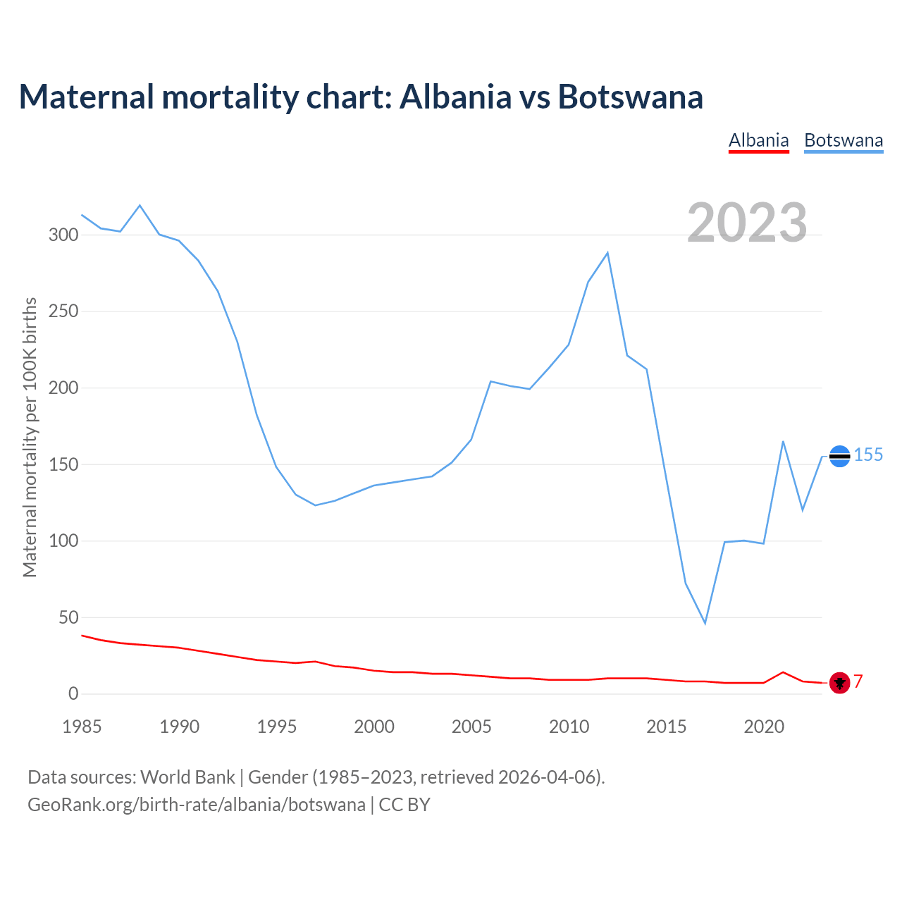 The maternal mortality rate, which is the probability of dying during childbirth or within 42 days of pregnancy termination, is 7 deaths per 100,000 live births in Albania, compared to 155 deaths in Botswana.