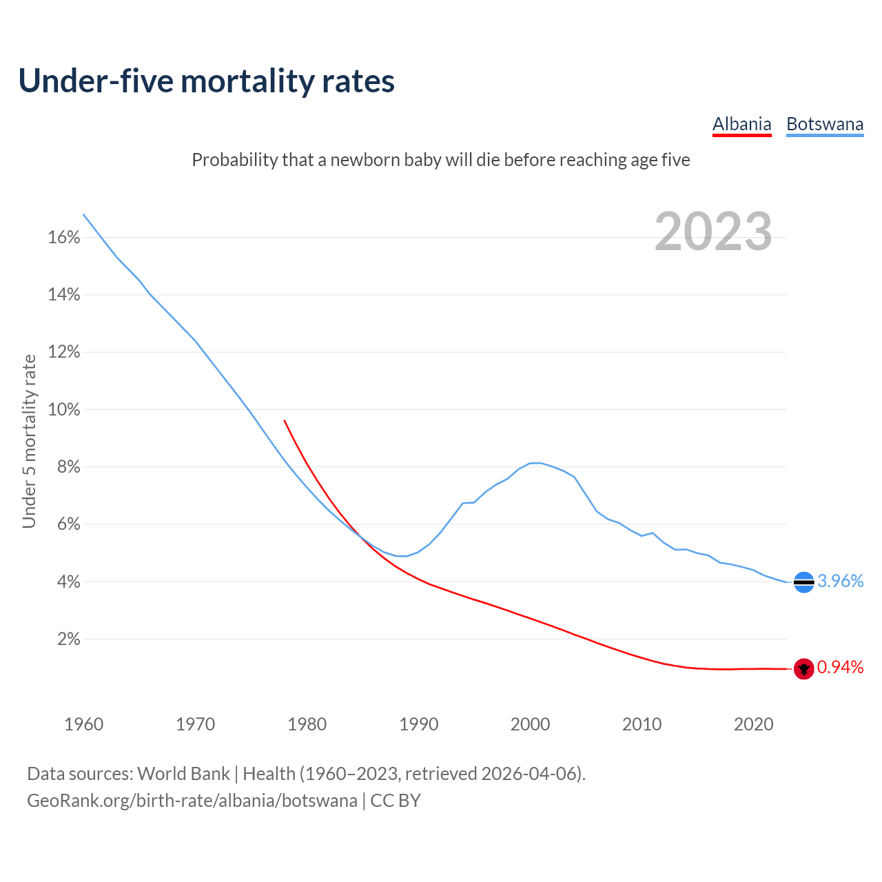 The chance that a newborn baby will die before reaching age five is 0.94% in Albania and 3.96% in Botswana. Above is a chart with historical data on under-five mortality rates.