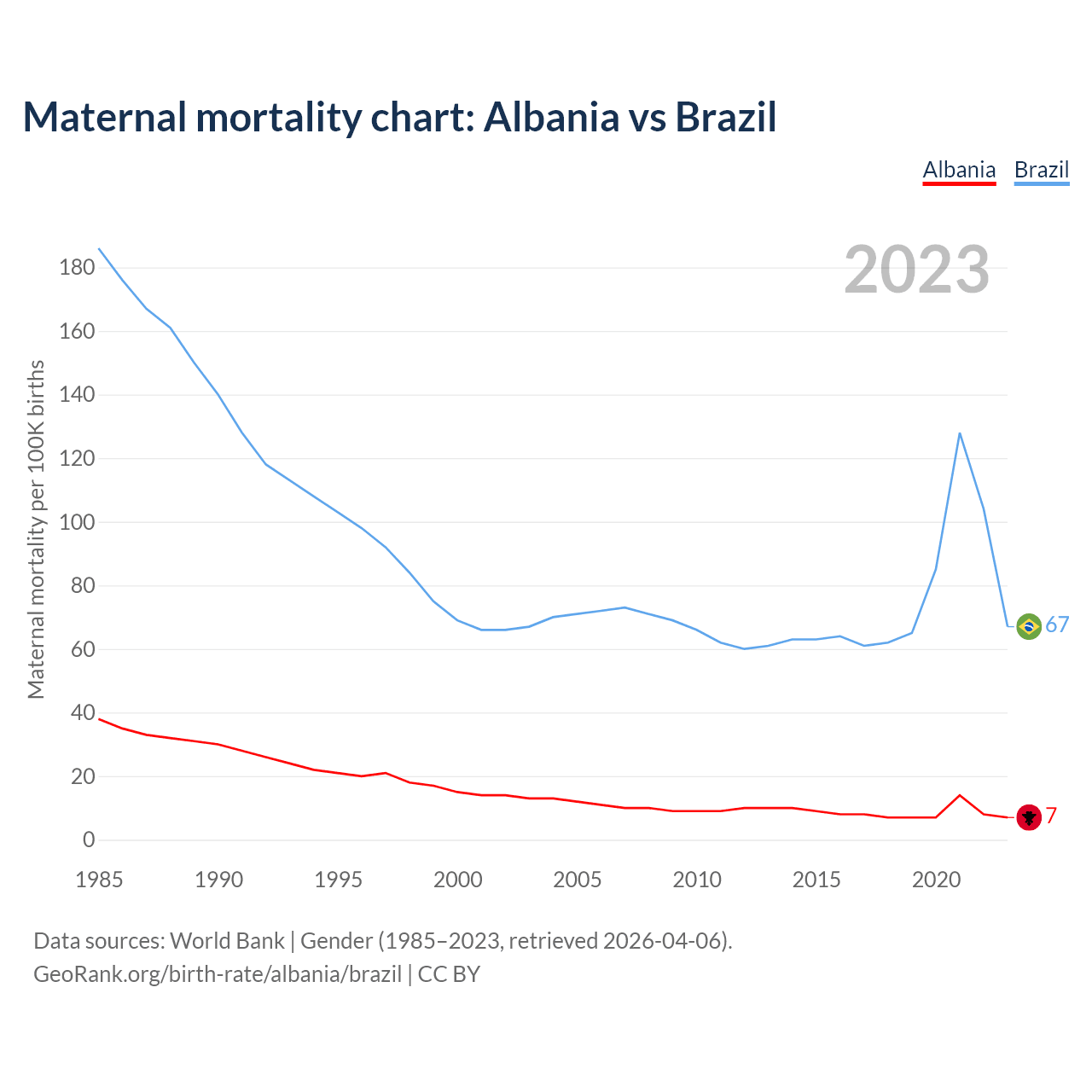 The maternal mortality rate, which is the probability of dying during childbirth or within 42 days of pregnancy termination, is 7 deaths per 100,000 live births in Albania, compared to 67 deaths in Brazil.