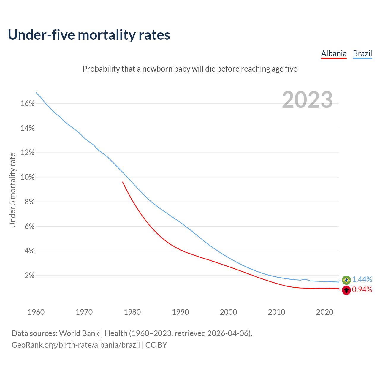 The chance that a newborn baby will die before reaching age five is 0.94% in Albania and 1.44% in Brazil. Above is a chart with historical data on under-five mortality rates.