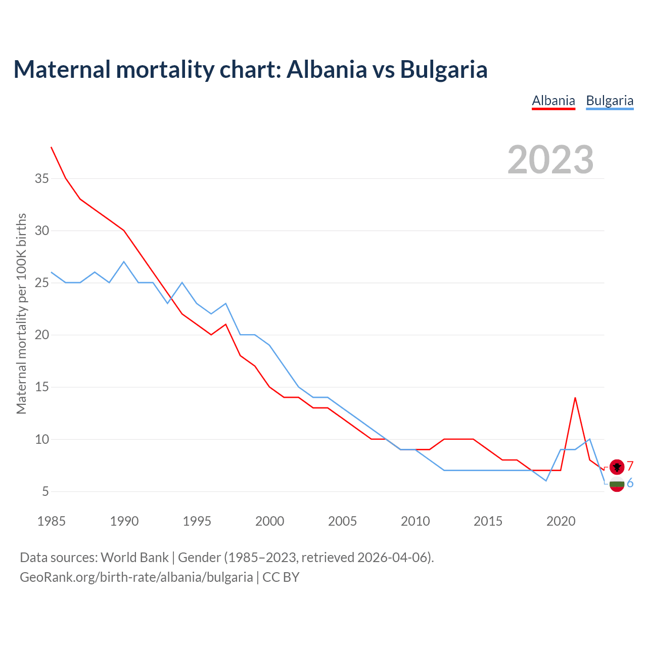 The maternal mortality rate, which is the probability of dying during childbirth or within 42 days of pregnancy termination, is 7 deaths per 100,000 live births in Albania, compared to 6 deaths in Bulgaria.