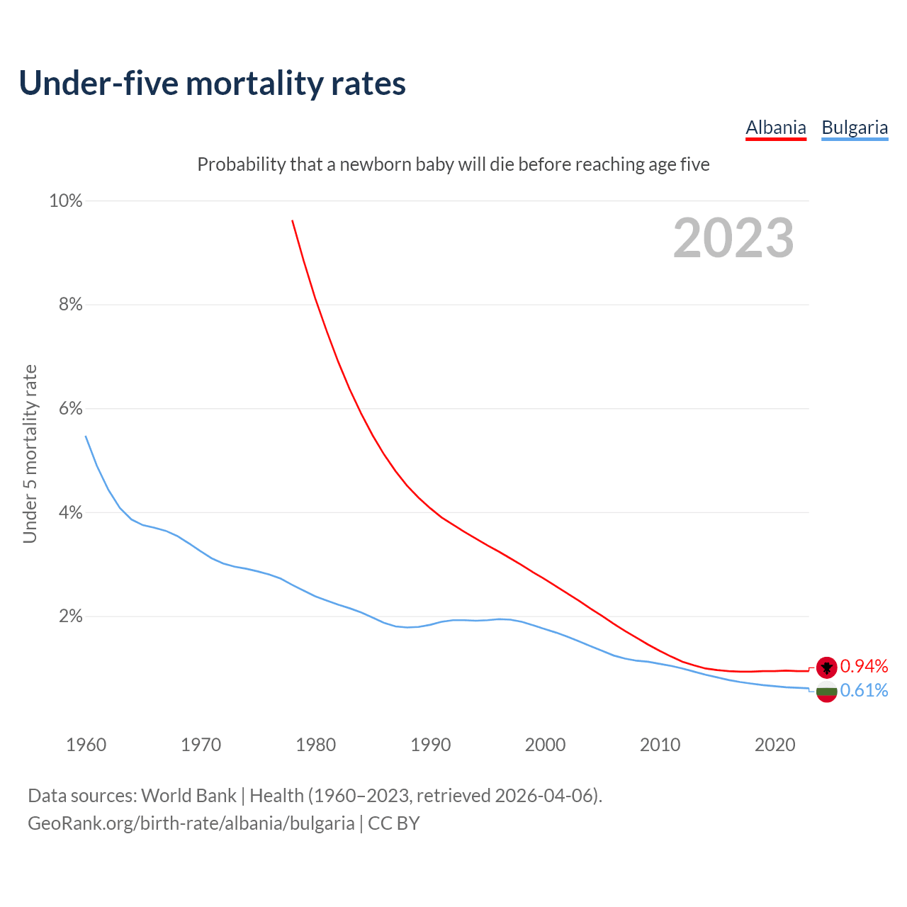 The chance that a newborn baby will die before reaching age five is 0.94% in Albania and 0.61% in Bulgaria. Above is a chart with historical data on under-five mortality rates.